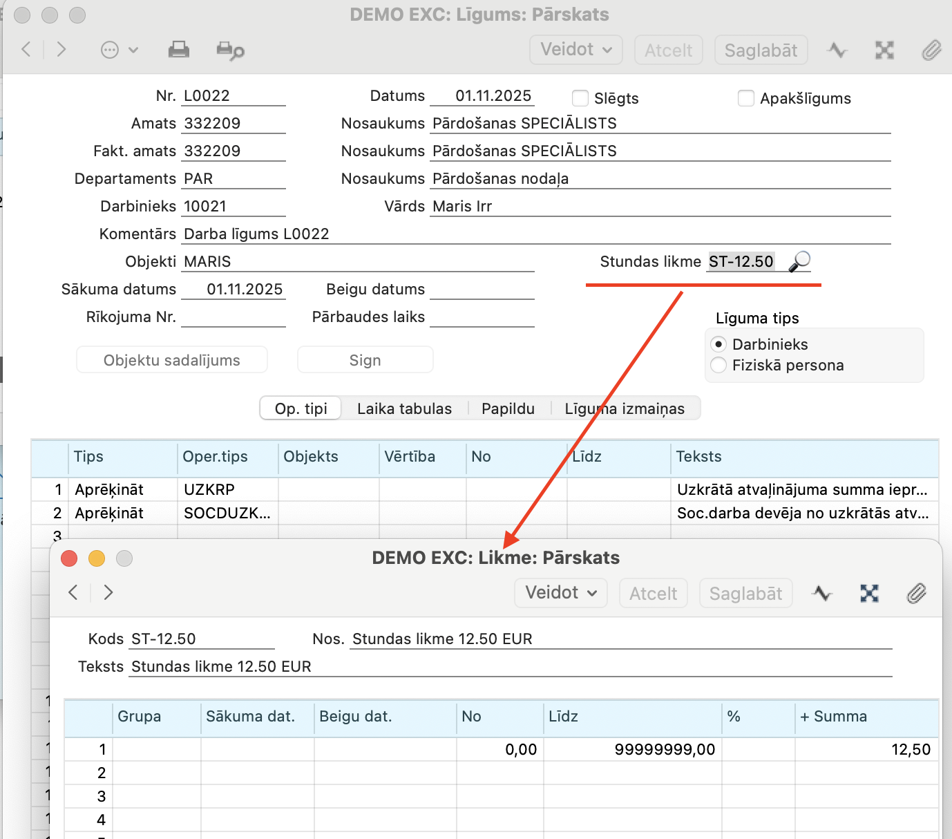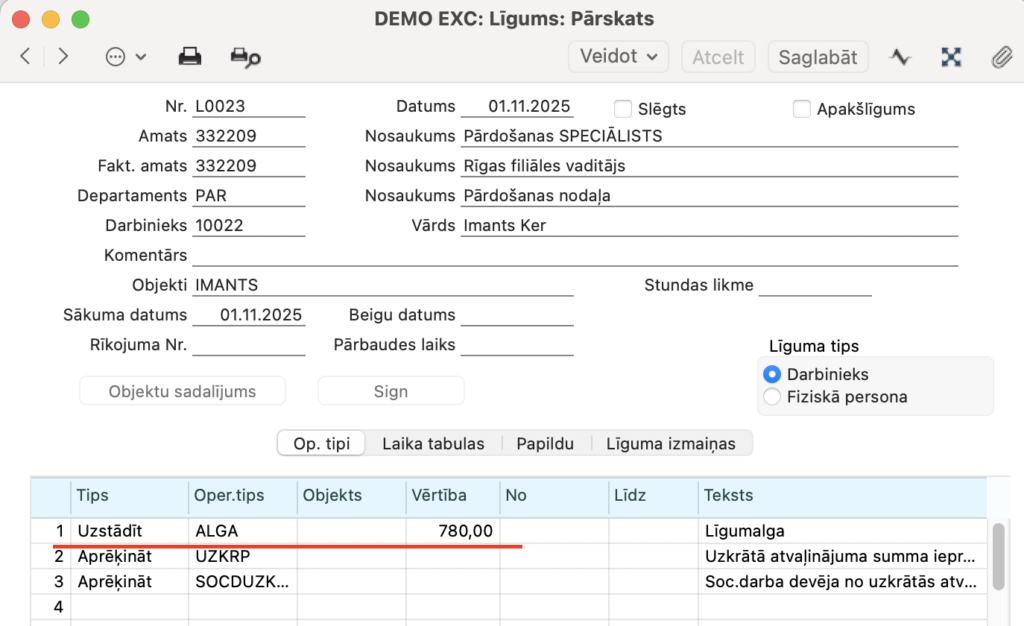 - Algas > Reģistri> Līgumi > ieraksta sadaļā Laika tabulas > lauks Laika klase – atteiksies uz konkrēto darbinieku