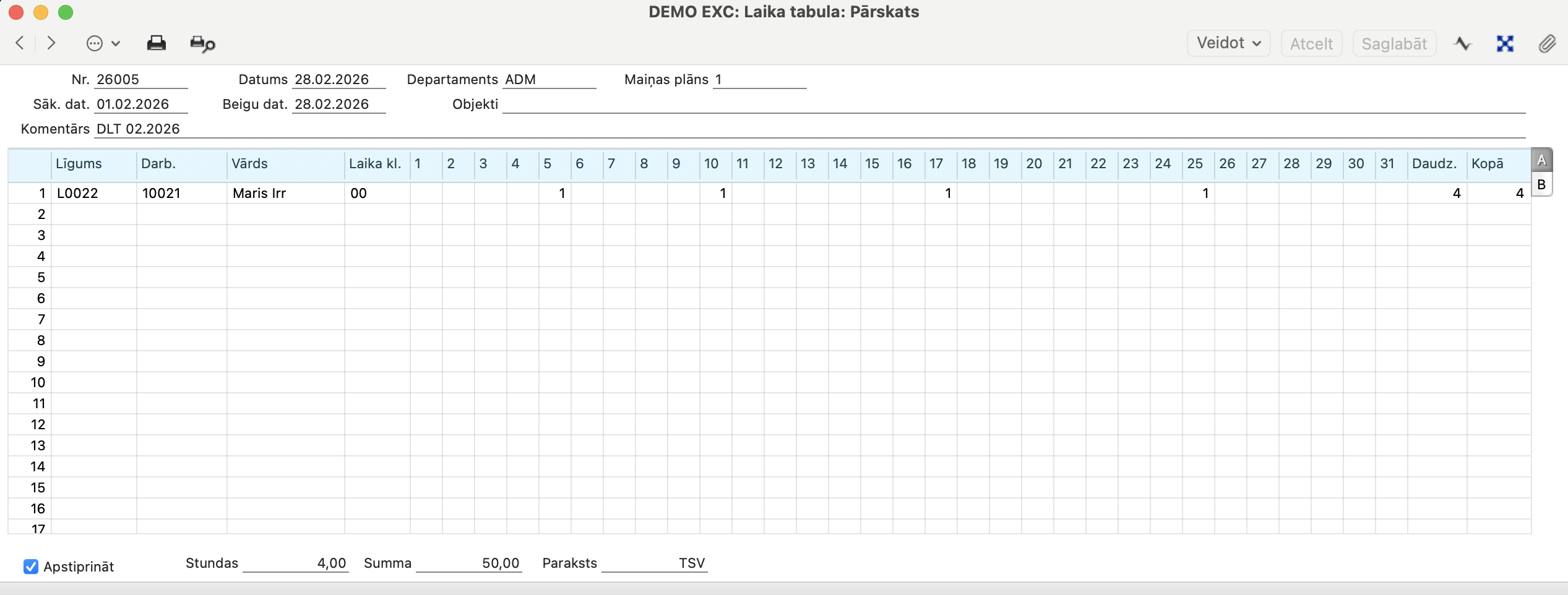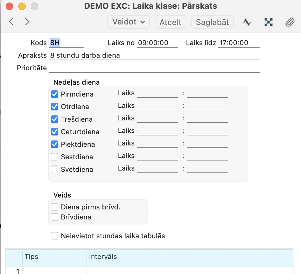 Ja izmantojat standarta Laika klasi 8H (8 stundas), programma jau bez Laika tabulas aizpildīšanas, balstoties uz šo iestatījumu, uzskaitīs: