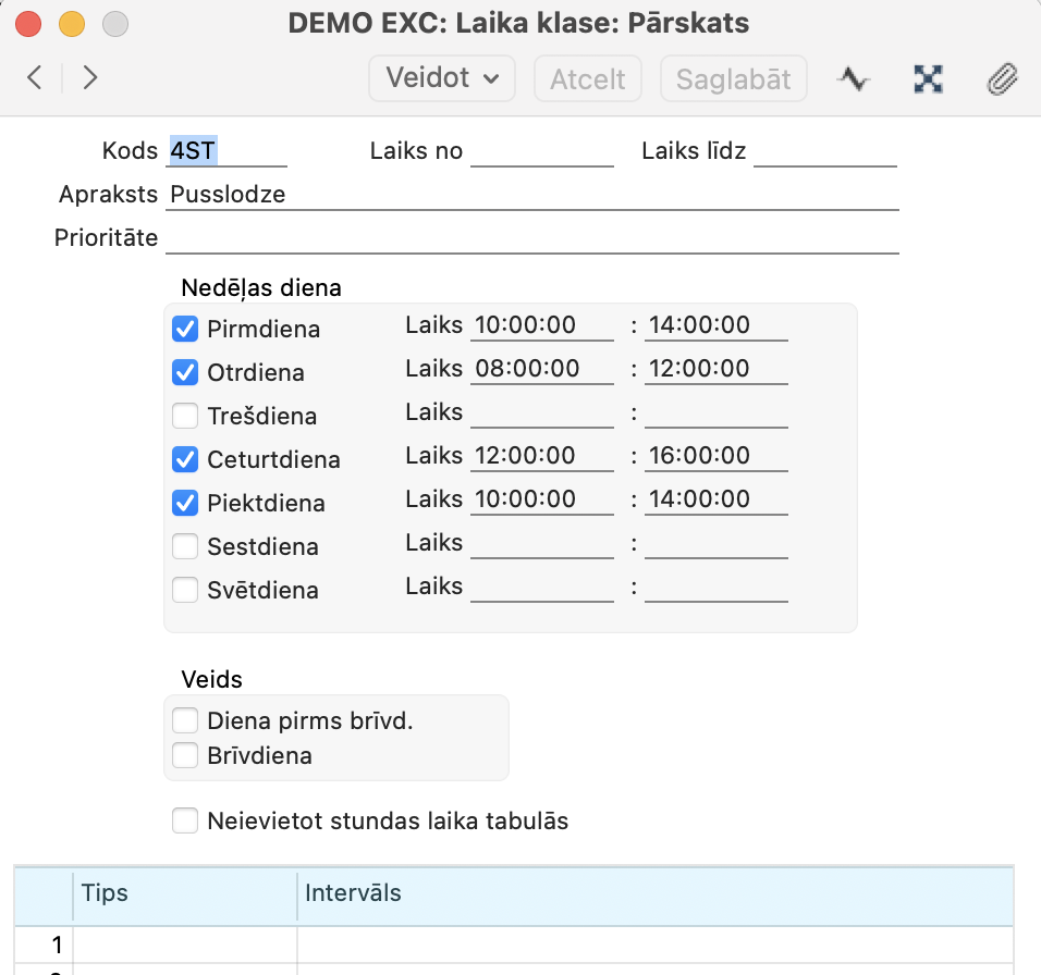 - 40 stundas nedēļā, ~ 160 stundas mēnesī, tikai tās darba dienas, kuras ir nodefinētas Laika klasē,
