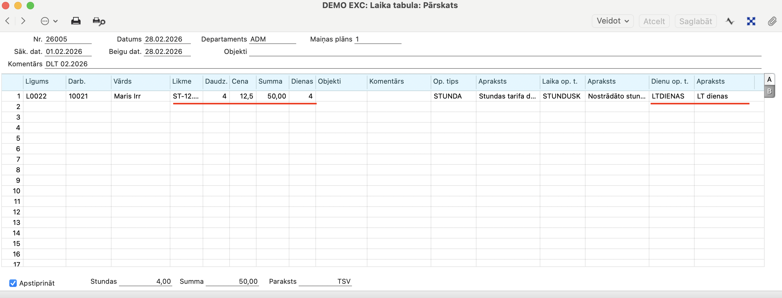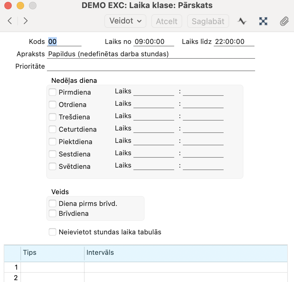 2. balstoties uz Laika klasi ar nulles vērtību, kas programmai liegs ievietot jebkādas stundas / dienas algu Aprēķina ierakstā pēc noklusējuma, un darba Laika tabulas aizpildīšana būs obligāta.