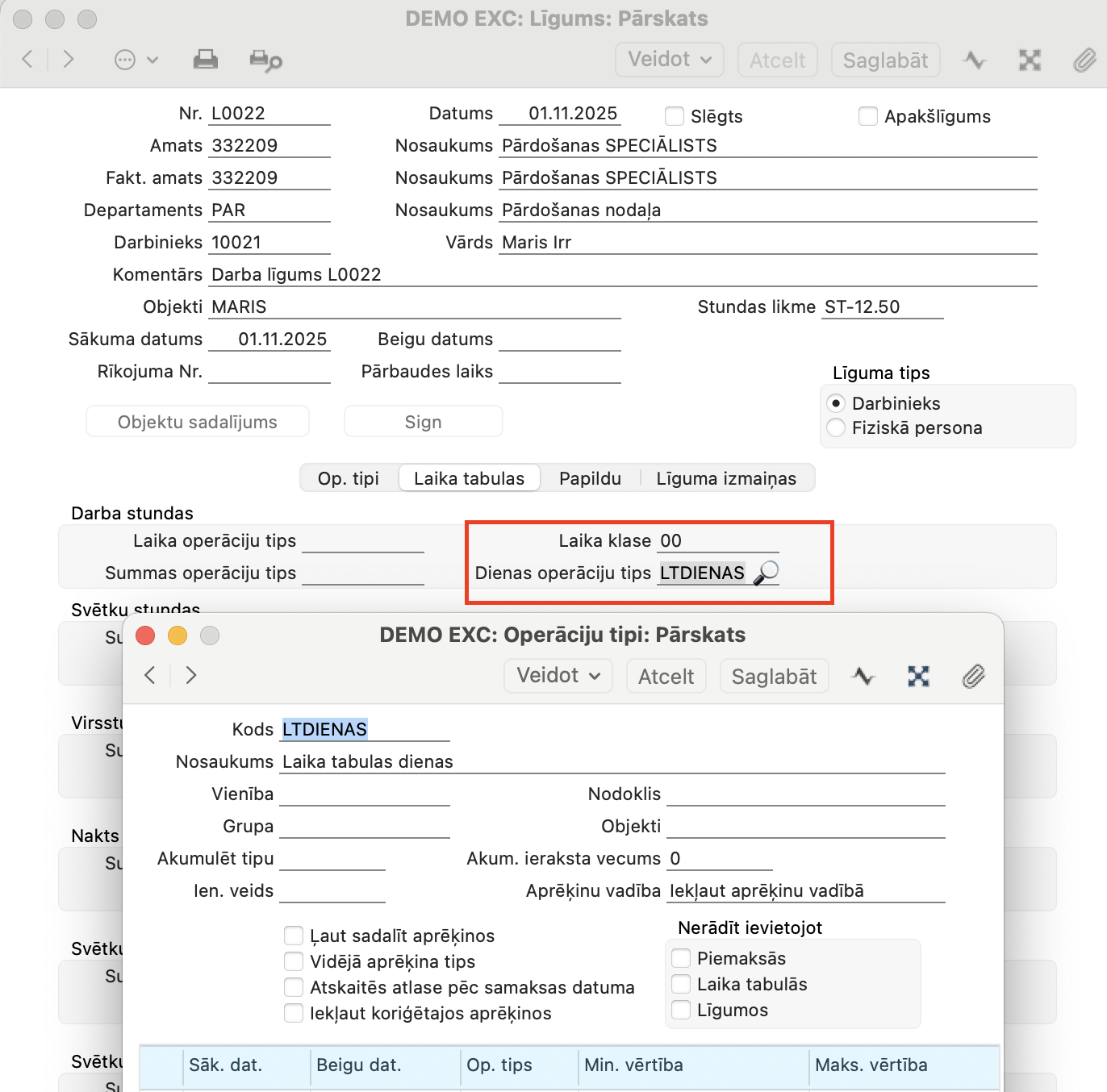 2. un balstoties uz Laika klasi, kurā norādītas darbinieka darba dienas un darba stundas.