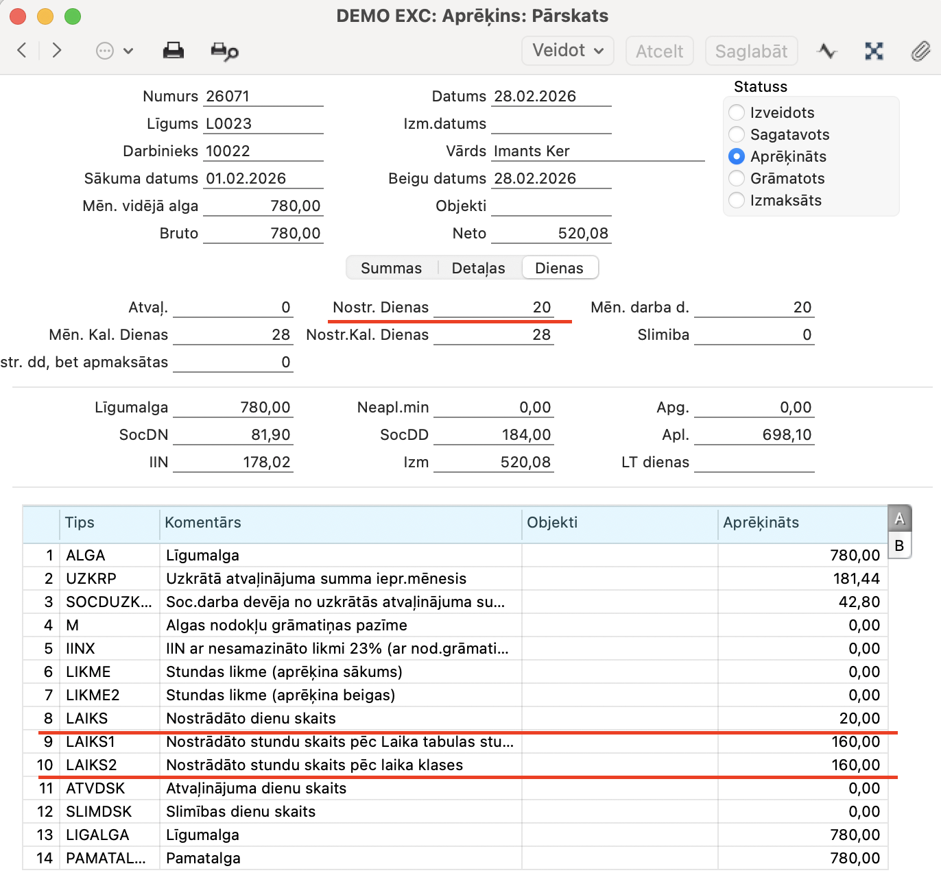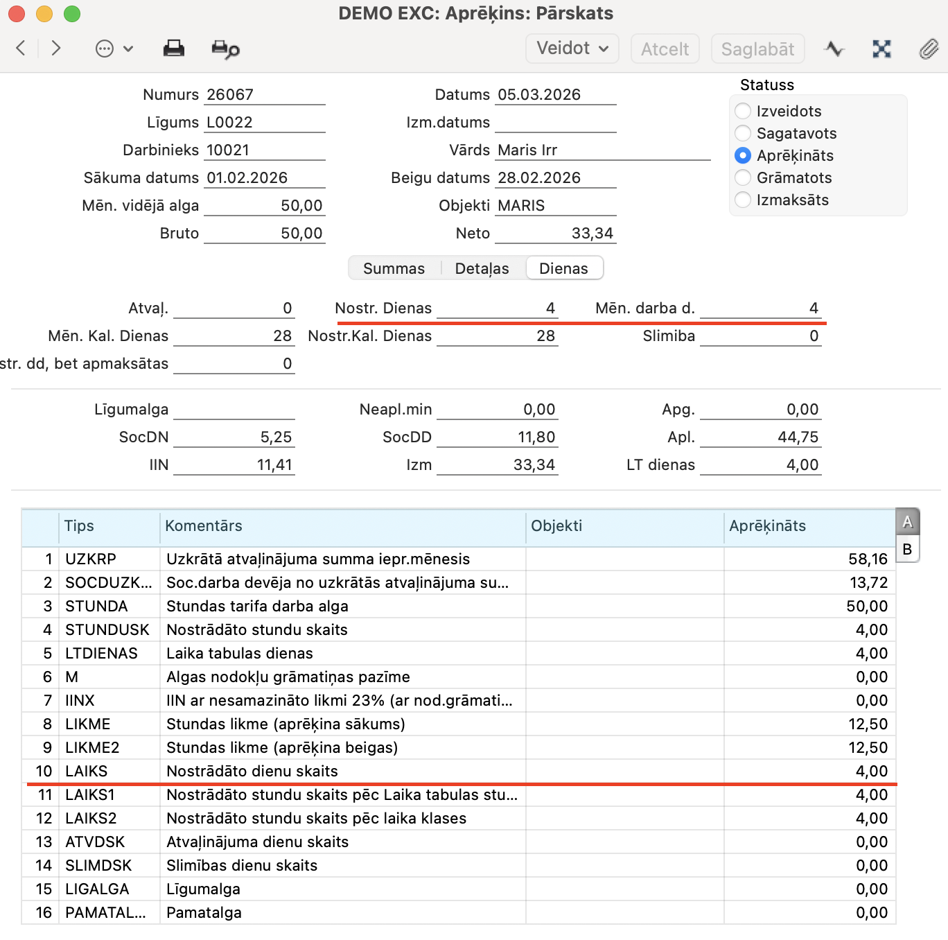 Ja darbiniekam ir noteikta mēneša alga, sistēma algu aprēķina: