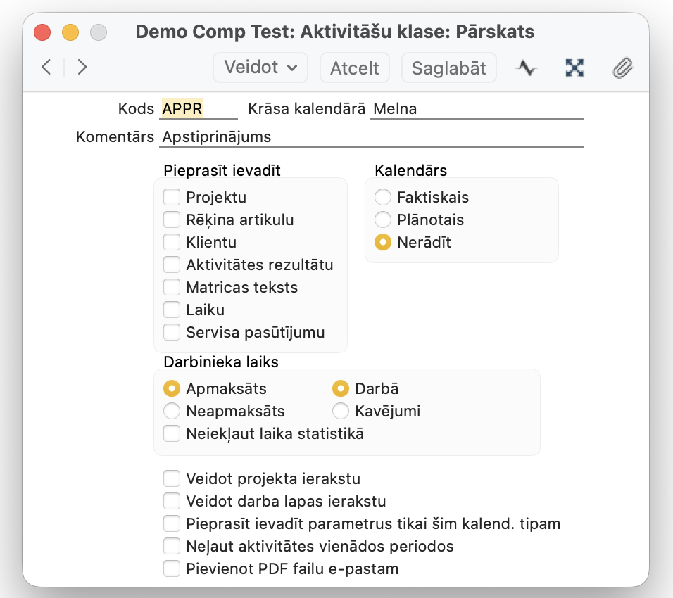 CRM > Iestatījumi > Aktivitāšu tipi jāizveido aktivitāšu tipi pēc šāda parauga.