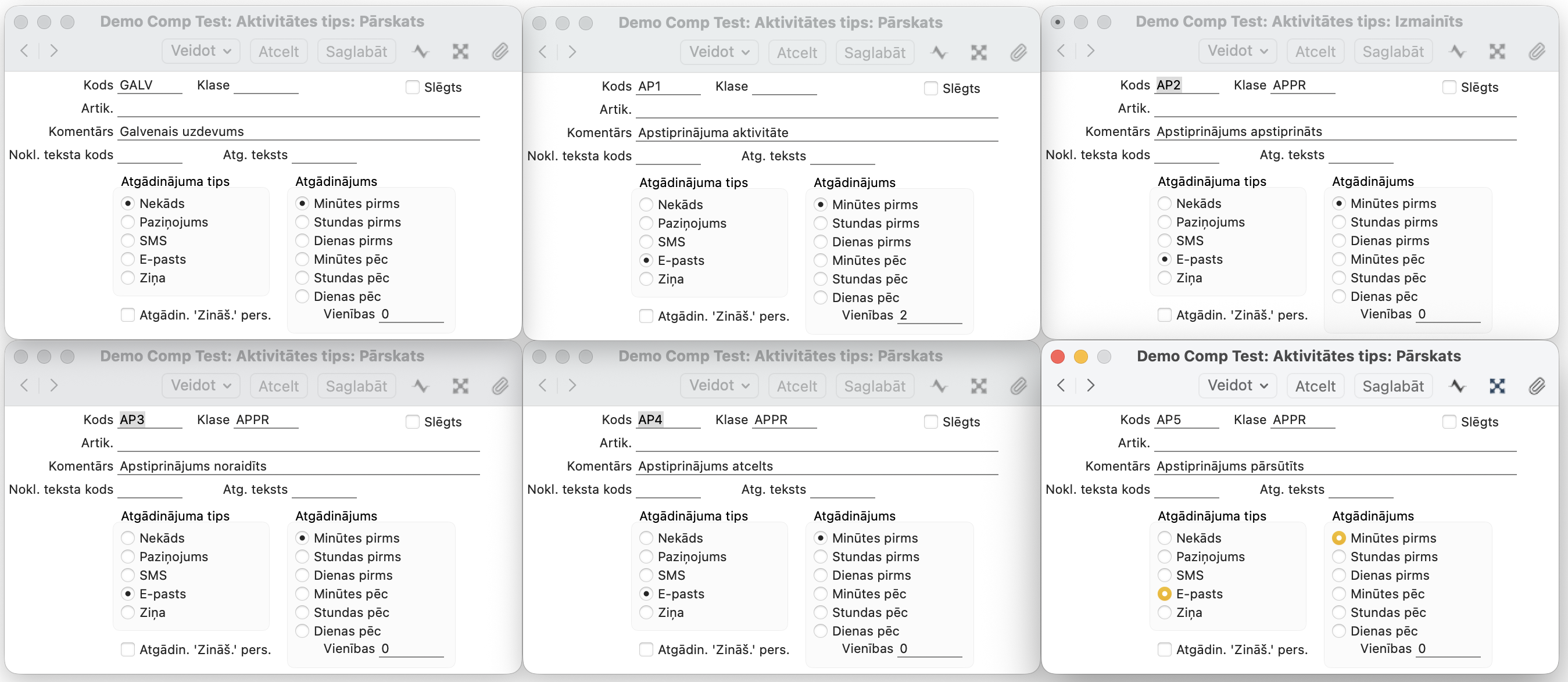 Šajā iestatījumā varat norādīt katrai aktivitātei atgādinājuma tipu, laiku un e-pasta gadījumā – Atgādinājuma tekstu, ko saņems apstiprinātājs.