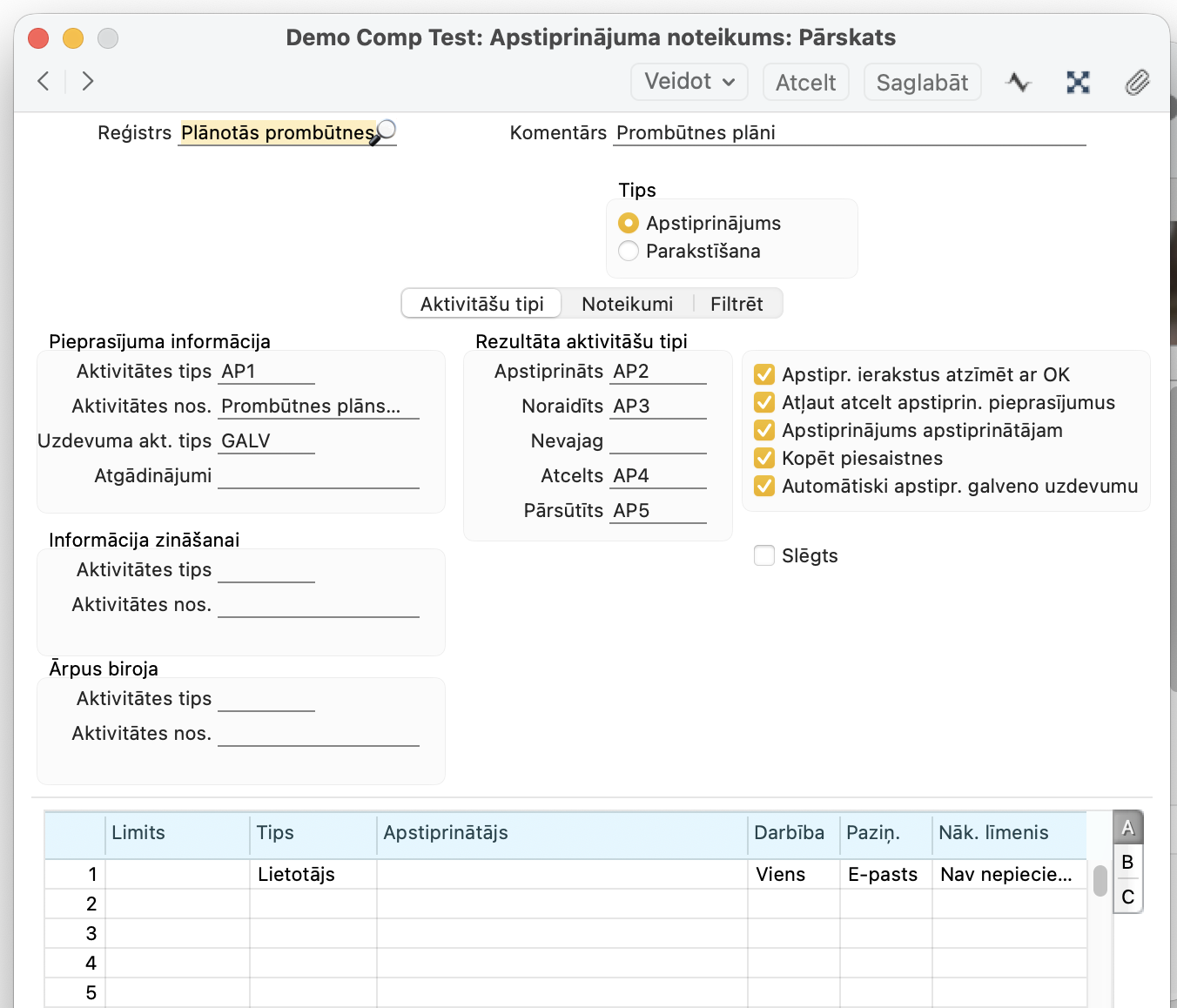 Automātiski apstiprināt galveno uzdevumu – apstiprināšanas galvenā aktivitāte (ar Uzdevuma akt. Tipu) tiek automātiski atzīmēta kā pabeigta pēc apstiprināšanas procesa beigām (apstiprināts/noraidīts/atcelts). Ja šī opcija nav atlasīta, galveno aktivitāte ir jāatzīmē kā pabeigta manuāli.