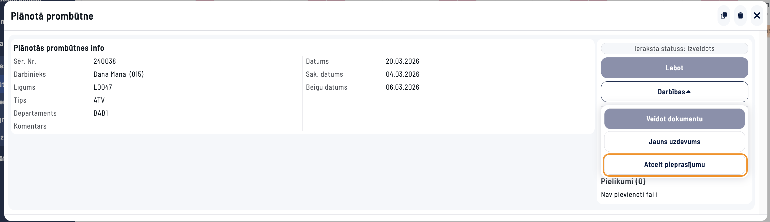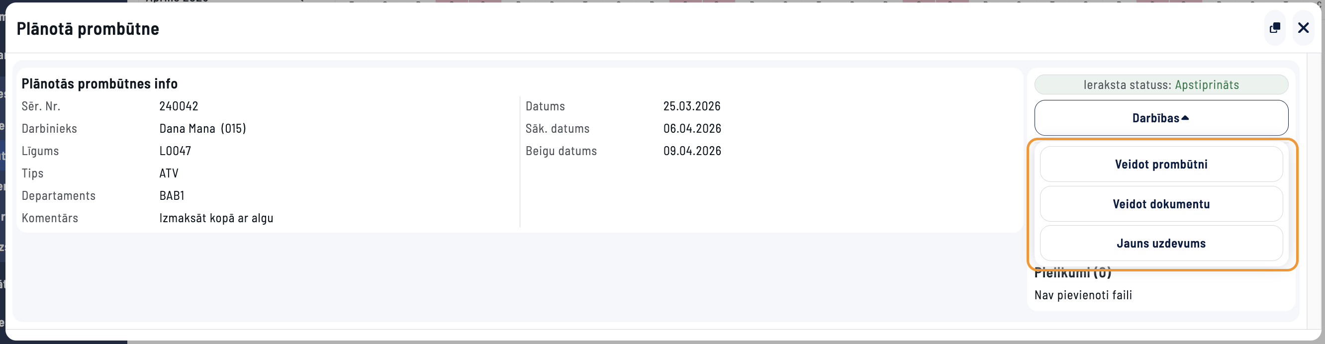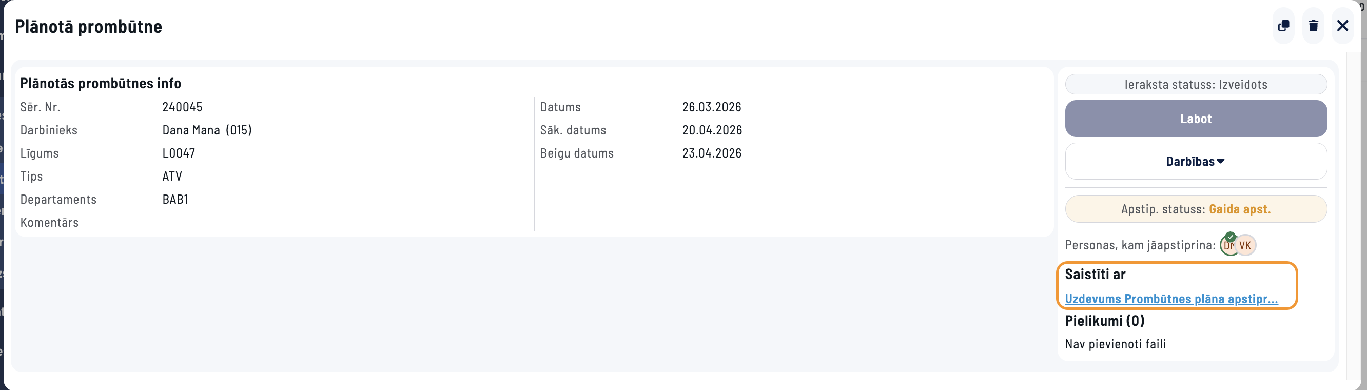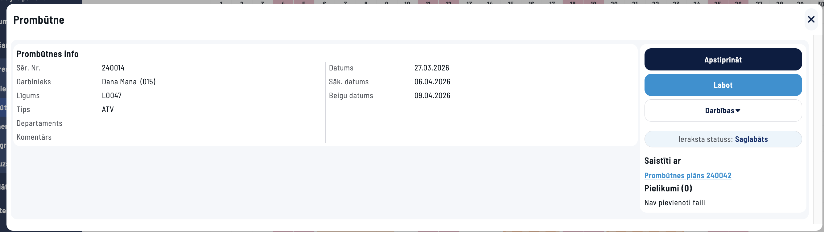 Saite uz Plānoto prombūtni būs pieejama no Prombūtnes ieraksta. No Prombūtnes ieraksta to ir iespējams apstiprināt, lai tā tiktu iekļauta algu aprēķinos.