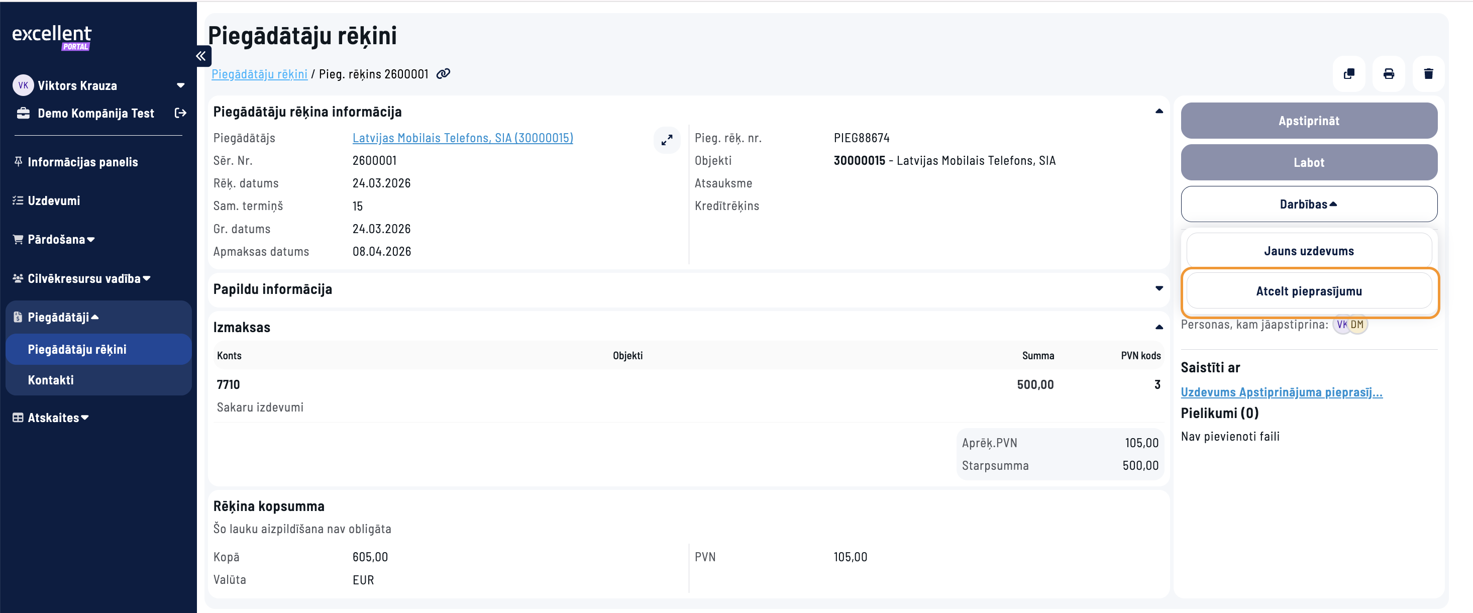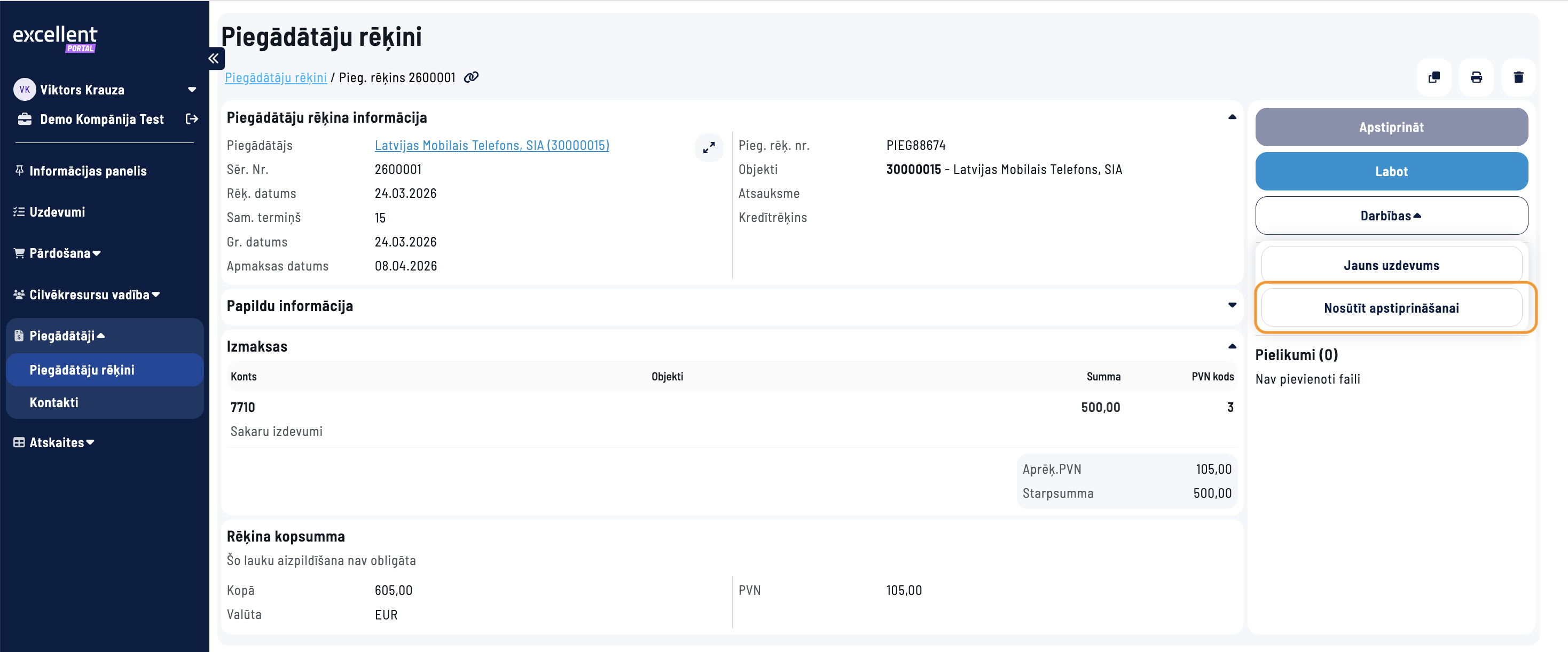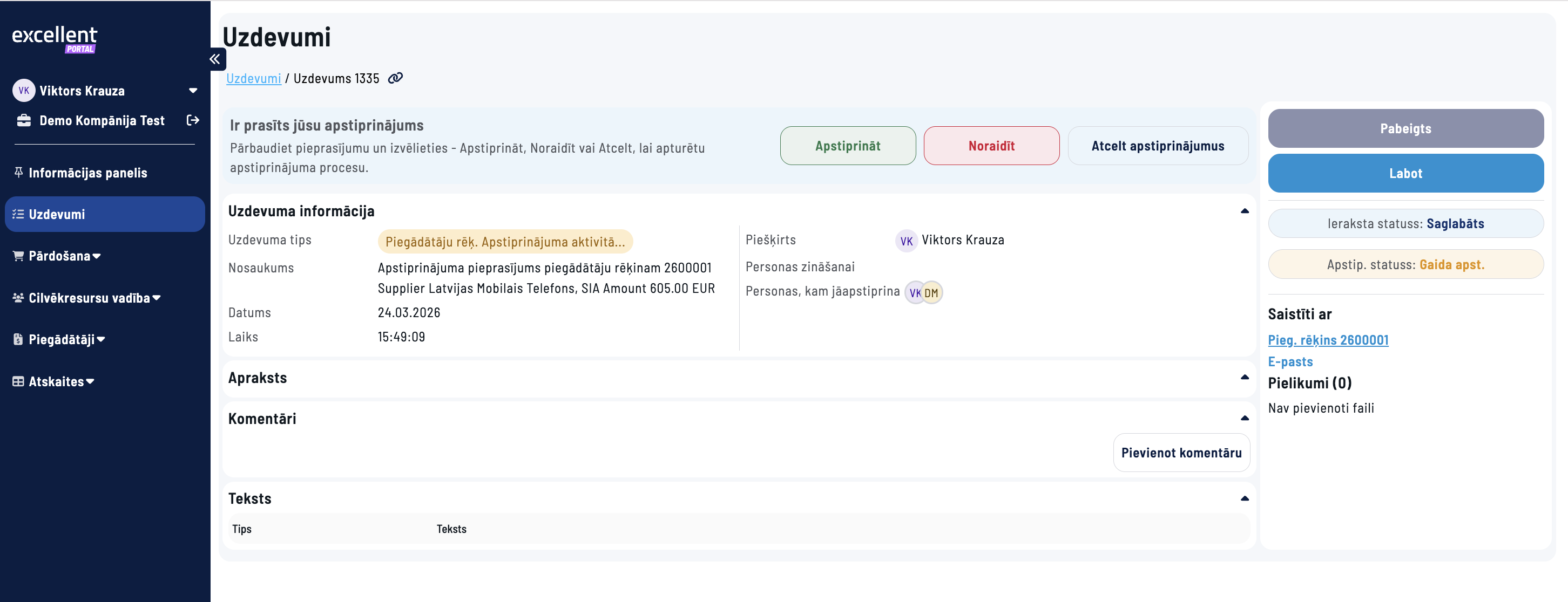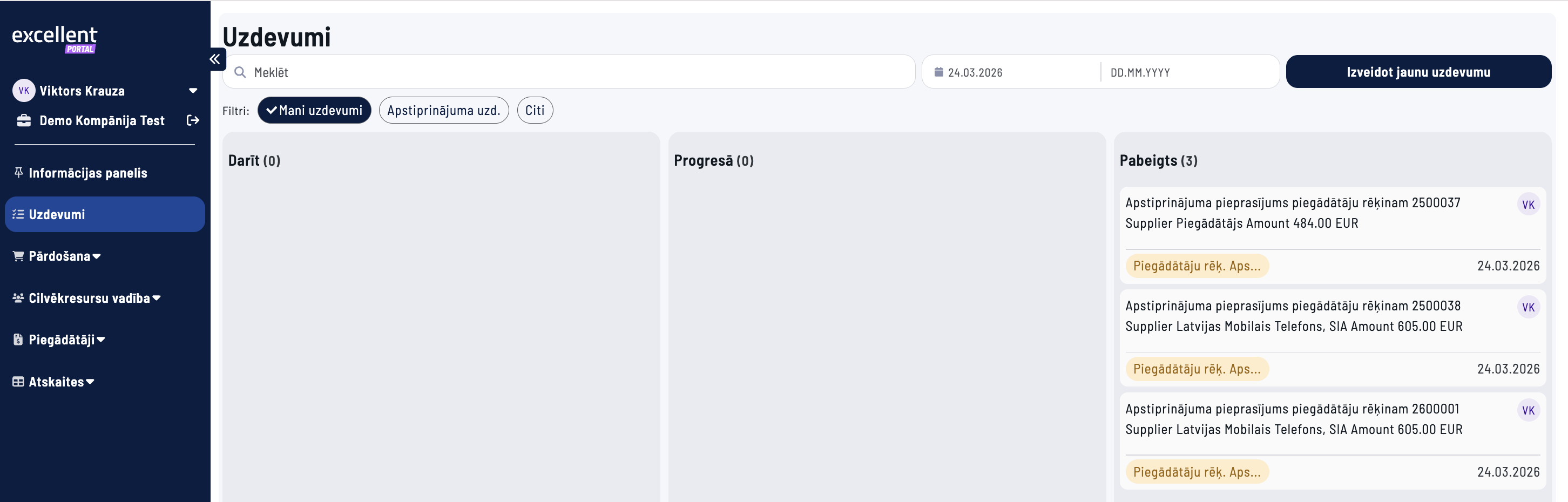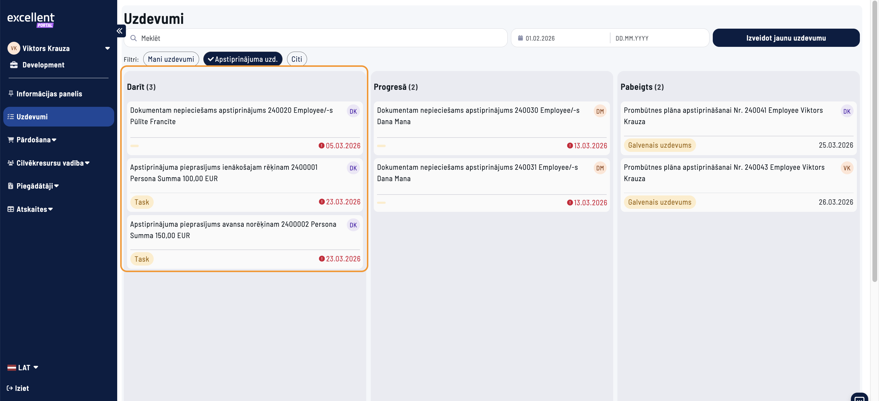 3. Apstiprinājuma pieprasījums tiks nosūtīts konkrētajam darbiniekam un viņa vadītājam. Tos var redzēt Excellent portāla sadaļā Uzdevumi, kur iespējams dokumentu apstiprināt. Pēc apstiprināšanas sadaļā Dokumenti šis dokuments būs redzams kā apstiprināts.