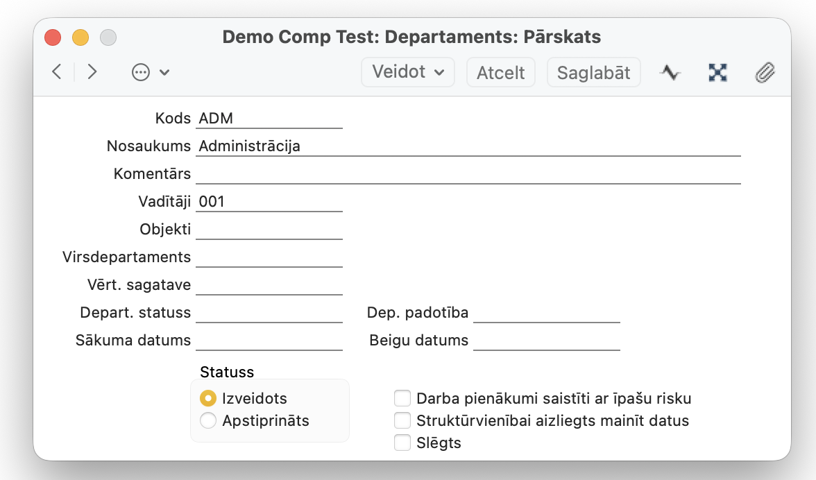 Modulī Personāls > Reģistri > Departamenti > Veidot > aizpilda sekojošos laukus: