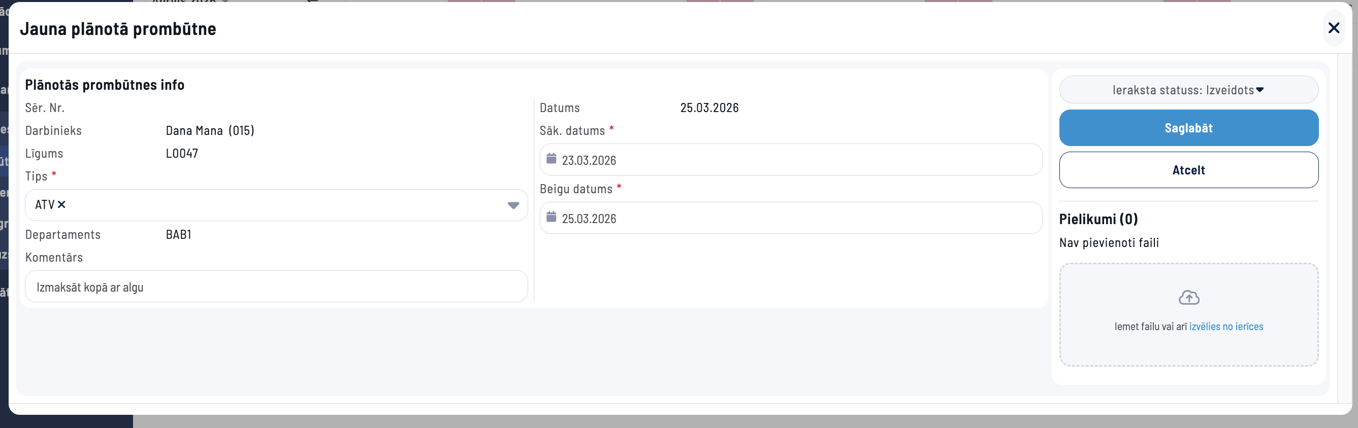Sadaļā Cilvēkresursu vadība > Prombūtnes noklikšķiniet uz pogas „Jauna prombūtne”. Tiks izveidots prombūtnes plāns, kas būs pieejams sistēmā modulī Personāls > Reģistri > Prombūtnes plāni.