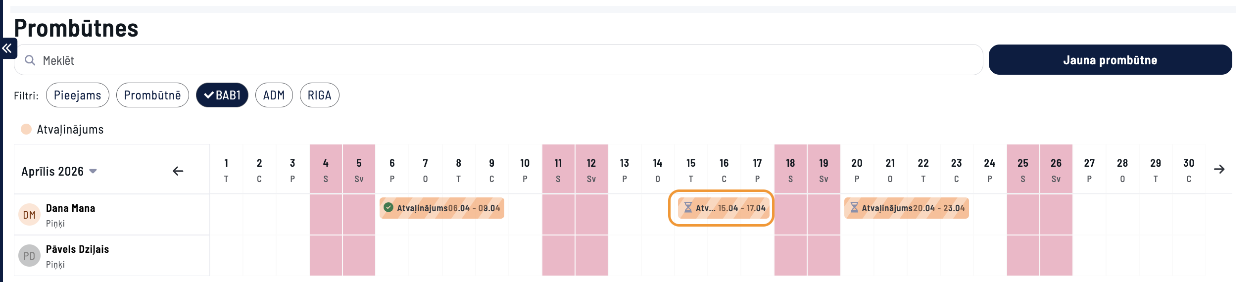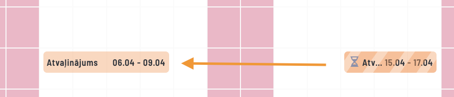 Pēc Veidot Prombūtni darbības Plānotā prombūtne kļūst par Prombūtnes ierakstu (ieraksta krāsa kalendārā mainās no strīpainas uz pilnu):
