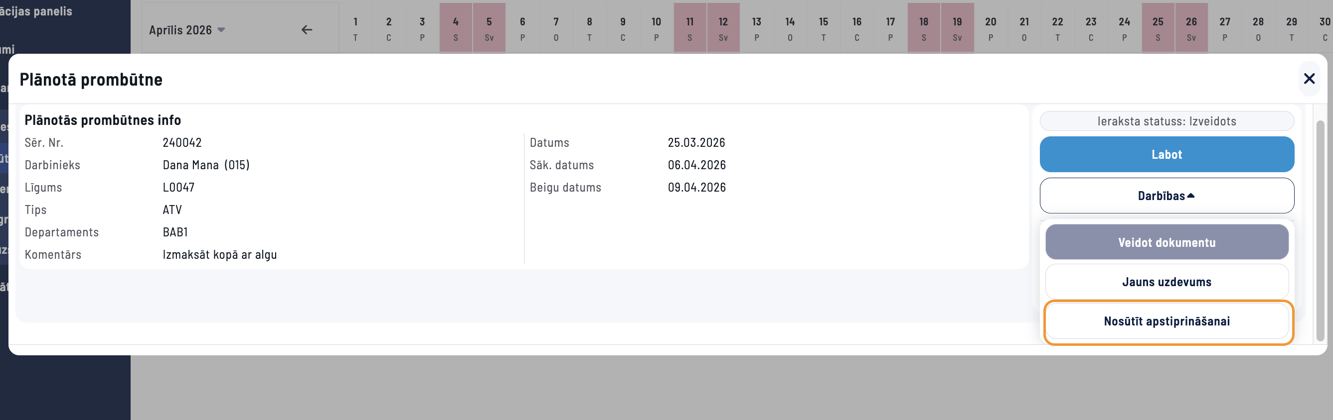 Pēc ieraksta saglabāšanas, lai prombūtnes plānu nosūtītu apstiprināšanai, spiest Darbības > Nosūtīt apstiprināšanai.