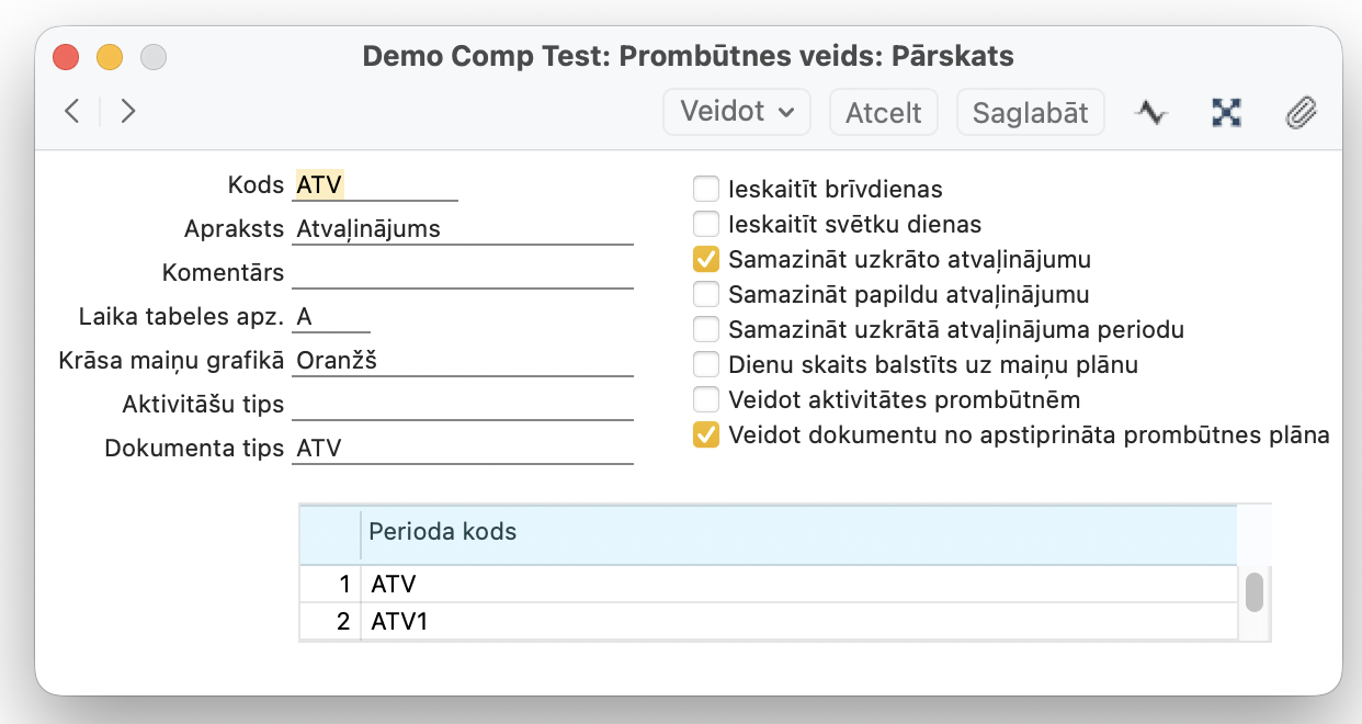 Personāls > Iestatījumi > Prombūtnes veids pārbauda sekojošo informāciju: