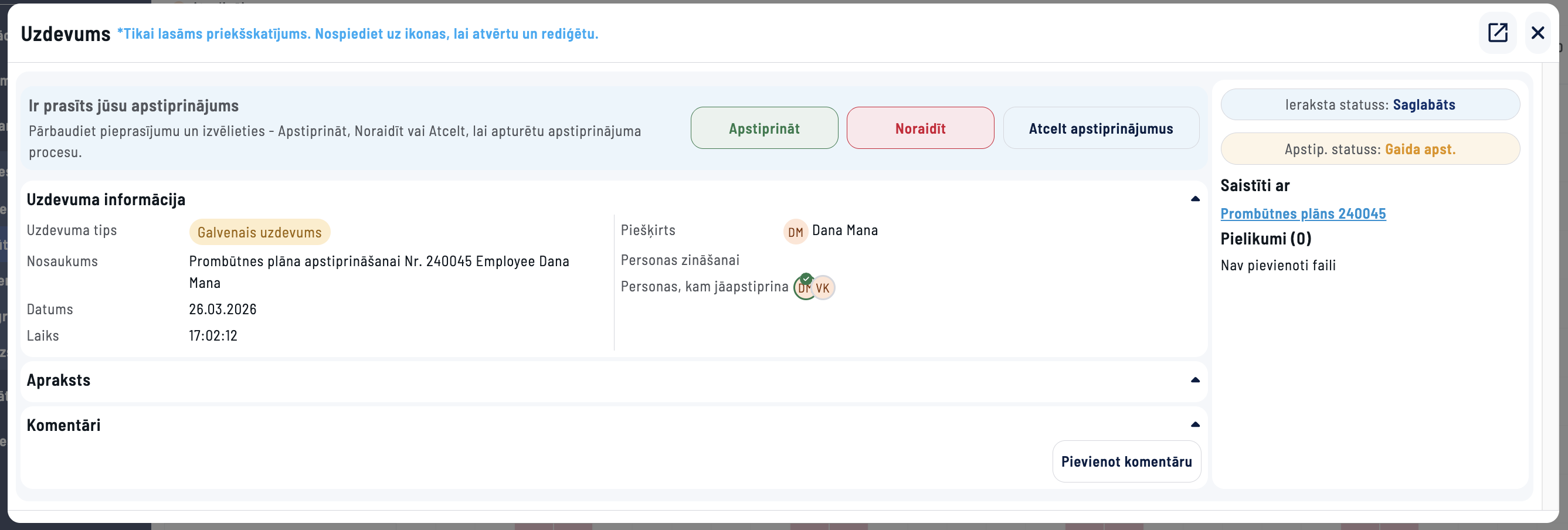 Atvērsies uzdevuma priekšskatījums, no kura vadītājs varēs Apstiprināt/Noraidīt uzdevumu vai atcelt apstiprinājumus.