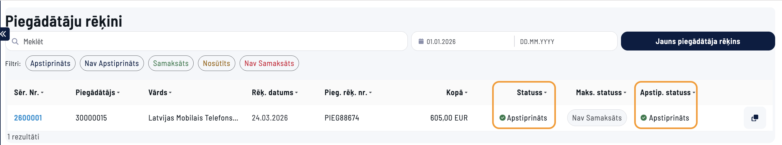 1. Dodieties uz vajadzīgo Reģistru, kuram ir izveidoti apstiprinājuma noteikumi, piemēram, Piegādātāji > Piegādātāju rēķini
