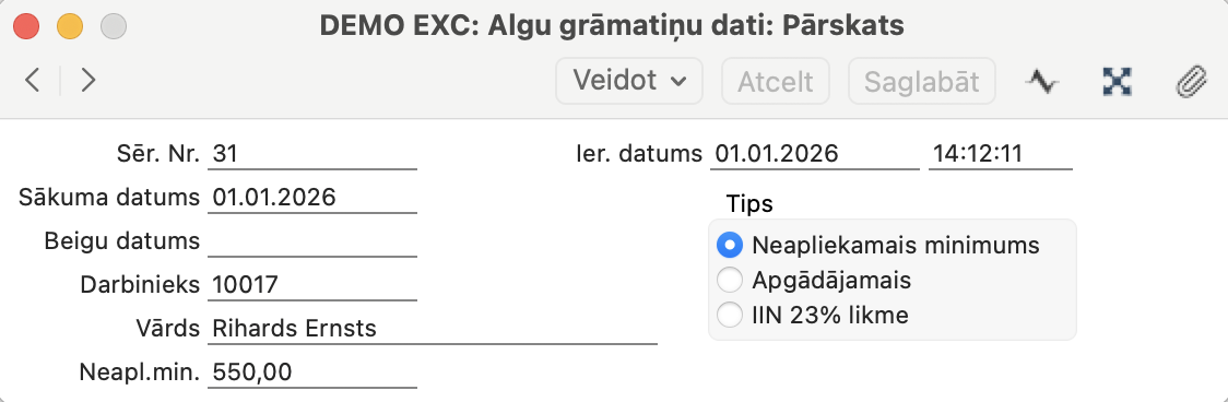 Algas > Iestatījumi > Algu grāmatiņu dati – atjaunot Darbinieku algu grāmatiņu datu ierakstus, kur norādīt aktuālo vērtību.