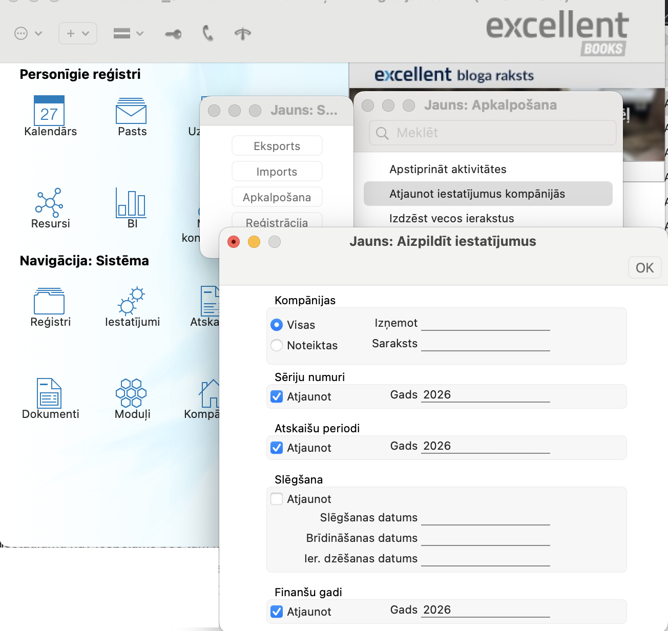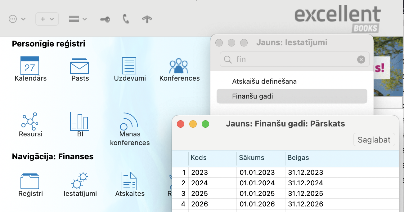 Iesākām Excellent ERP un Excellent Books programmā veikt sekojošas darbības: