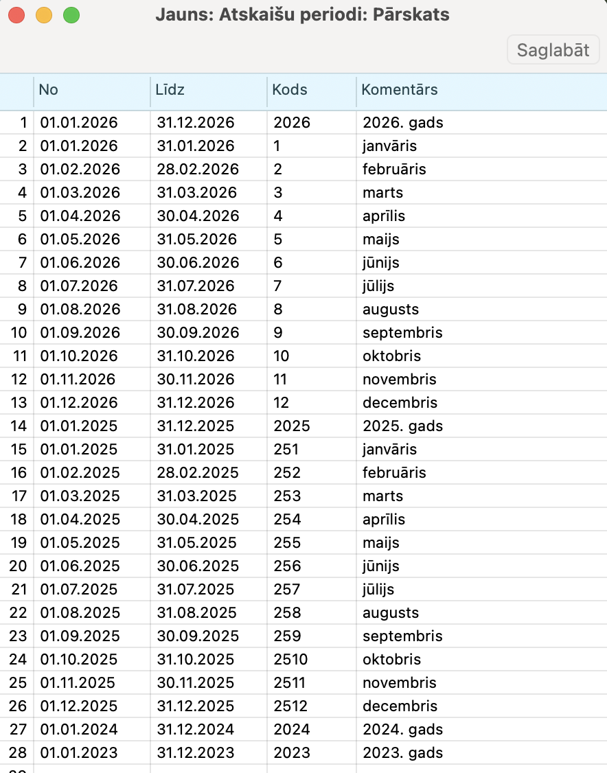 - Modulis Sistēma > Iestatījumi > Atskaišu periodi