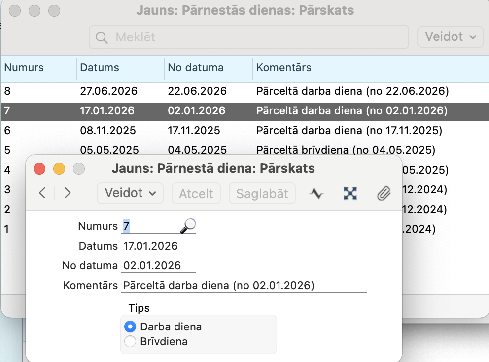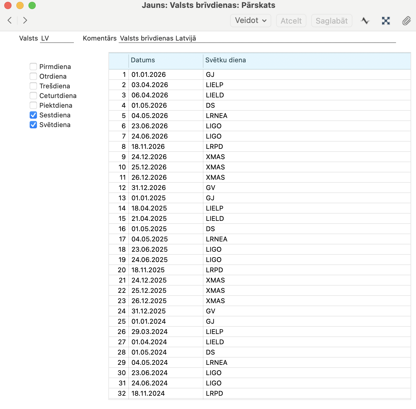 - Lai programma korekti uzskaitītu darba stundas Laika tabulās un Algu aprēķinos modulī Algas/Sistēma > Iestatījumi > Valsts brīvdienas > obligāti jāpapildina jau izveidoto valsts brīvdienu ierakstu ar jaunajām Svētku dienām Latvijā.