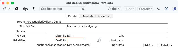 Lietotājs – automātiski pievienots no galvenās aktivitātes ieraksta darbplūsmas vadībā, lauka “Lietotājs”. Ja vajadzīgs to mainīt, tad to var izdarīt ierakstā. E-pasts un vārds mainīsies atbilstoši informācijai Sistēma > Reģistri > Personas.