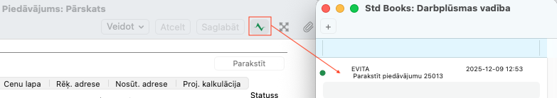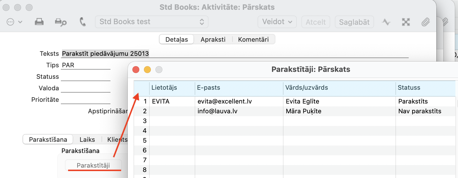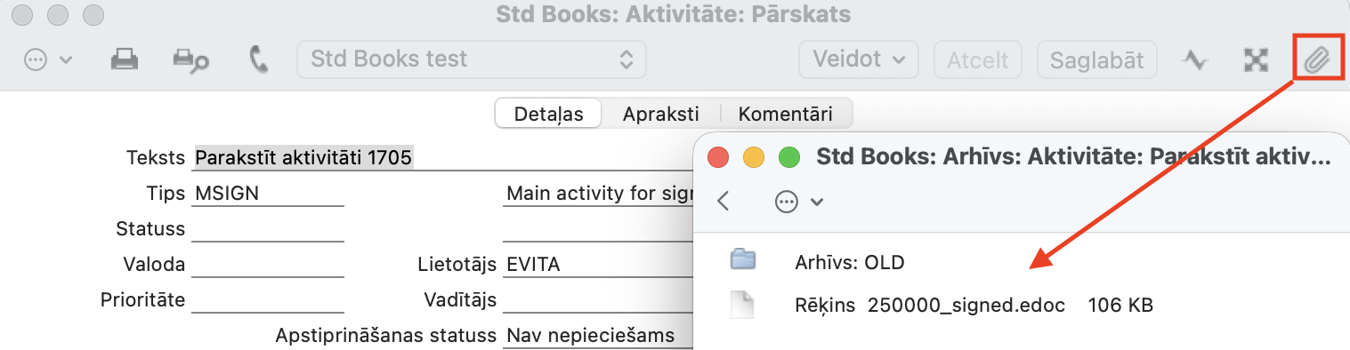 Noklikšķinot “Parakstīt”, tiek atvērts jauns logs “Parakstītāji”, atvērts pielikumā esošais dokuments un fonā tiek izveidota galvenā aktivitāte.