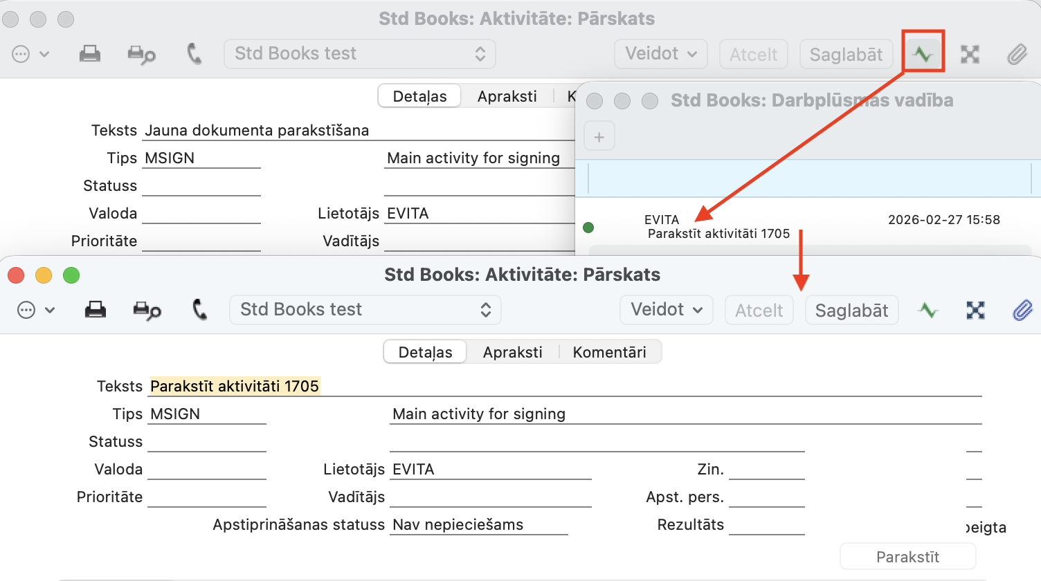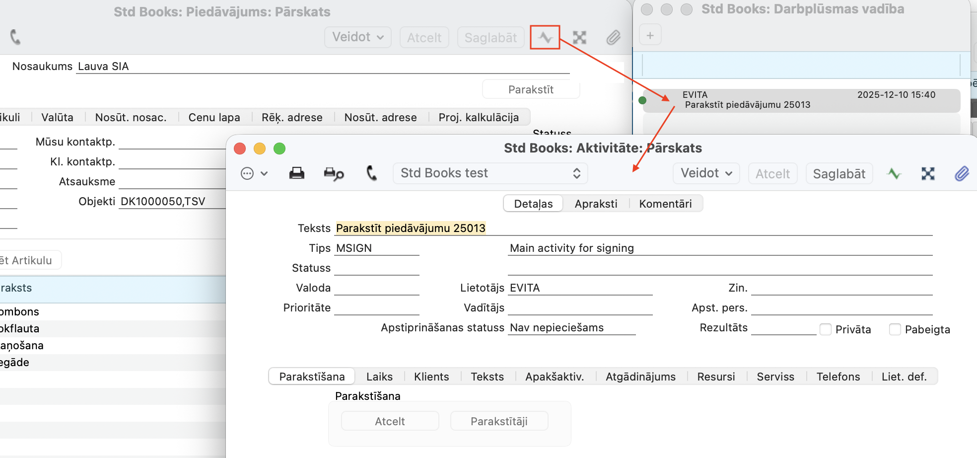 Uzdevuma akt. Tips – grupē visas parakstīšanas aktivitātes, kas tiek izveidotas konkrētai parakstīšanai. Lai pārraudzītu visas aktivitātes, kas notiek vienas parakstīšanas laikā, tiks izveidots galvenais uzdevums, kas tiek nozīmēts lietotājam, kas pieprasa parakstīšanu. Ja lietotājs A izveido parakst. pieprasījumu lietotājam B, tad A un B redz Aktivitāti ar aizpildītu lauku “Aktivitātes tips”. Lietotājs A papildus redz arī aktivitāti ar aizpildītu lauku Uzdevuma akt. Tips (savā Uzdevumu sarakstā un ierakstā), kas palīdz pārraudzīt parakst. procesa progresu (CRM > Iestatījumi > Aktivitāšu tipi).