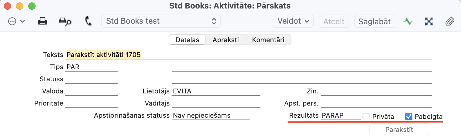 Saglabājiet. Pēc saglabāšanas aktivitātes ieraksts tiek aizvērts, un lietotājam aktivitātes ieraksts ir jāatver manuāli.