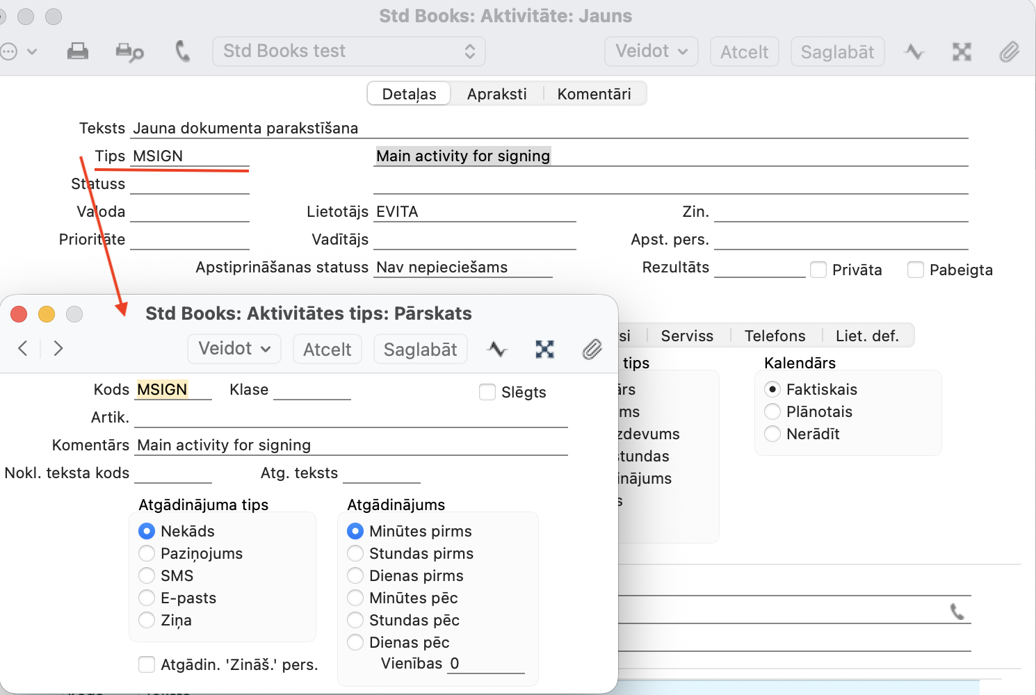 Tips – parakstīšanas galvenā uzdevuma veids (CRM > Iestatījumi > Aktivitāšu tipi). Tāda pati funkcija kā Darījumu paziņojumi > Reģistri > Apstiprinājuma noteikumi > lauks “Uzdevuma akt. Tips” (skat. Dokobit un parakstīšanas iestatījumi)