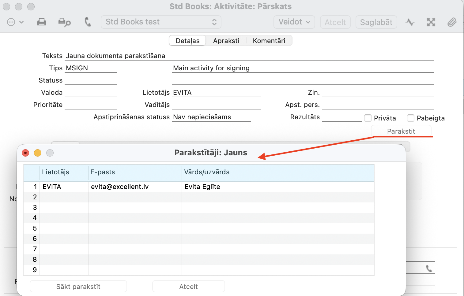 4. Noklikšķinot “Parakstīt”, tiek atvērts jauns logs “Parakstītāji”, atvērts pielikumā esošais dokuments un fonā tiek izveidota galvenā aktivitāte.