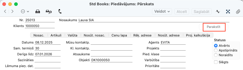 Vārds/Uzvārds — no Sistēma > Reģistri > Personas > lauka “Nosaukums”, vai, ja izvēlēts Globālais lietotājs, tad Tehniskie parametri > Reģistri > Globālie lietotāji > lauka “Vārds. Vārdu/Uzvārdu var mainīt manuāli, vai, ja tiek mainīts Lietotājs, mainās arī Vārds/Uzvārds.