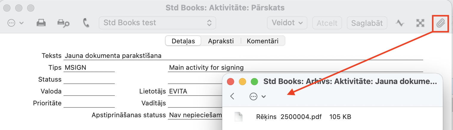 3. Uzdevumā zem saspraudes pievienojiet dokumentu, ko nepieciešams parakstīt.