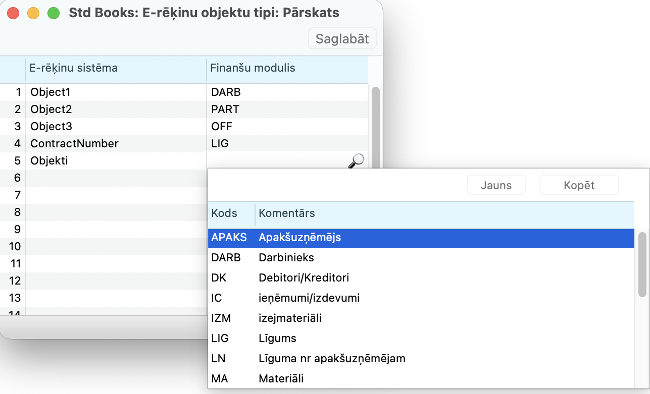 Izmantot “E-rēķinu objektu tipi” – izvēlaties, ja vēlaties, lai sistēma korekti identificē objektus saņemtajos e-rēķinos no Realizācija > Iestatījumi > E-rēķinu objektu tipi.