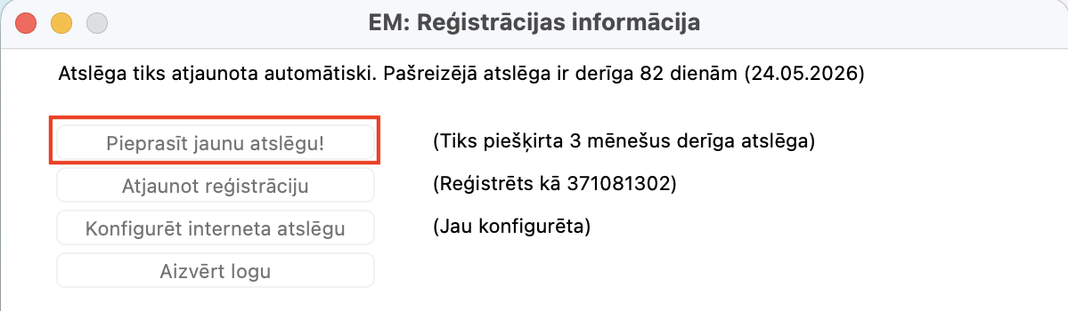 Klikšķiniet uz pogas “Saņemt atslēgu”. Pēc atslēgas pieprasījuma parādīsies paziņojums Atslēga saņemta. Noklikšķiniet uz “OK” un aizveriet programmu. Pārbaudiet, vai ieejot programmā joprojām parādās minētais paziņojums.