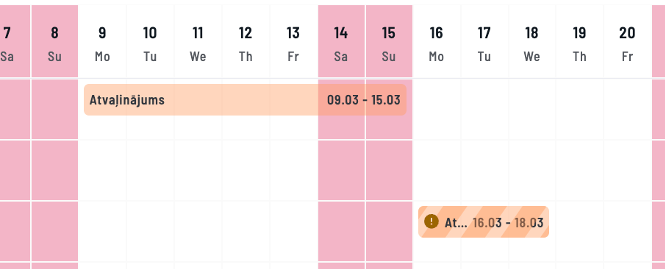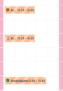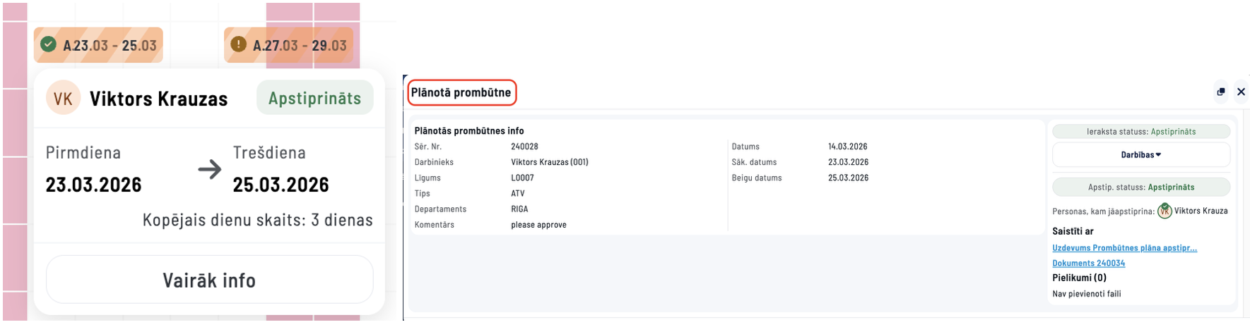 - Kad no Plānotās prombūtnes tiek izveidota Prombūtne, ieraksta krāsa automātiski mainās no svītrotas uz pilnu