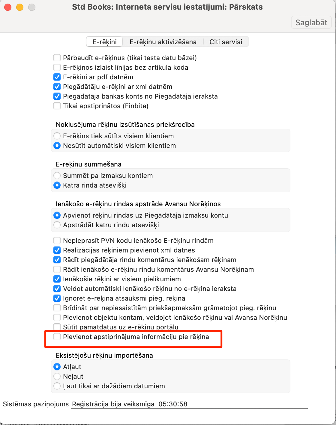 2. Excellent Books modulī Sistēma > Iestatījumi > E-pakalpojumu iestatījumi > sadaļā E-rēķini > nepieciešams ieslēgt: “Pievienot apstiprinājuma informāciju pie rēķina”.