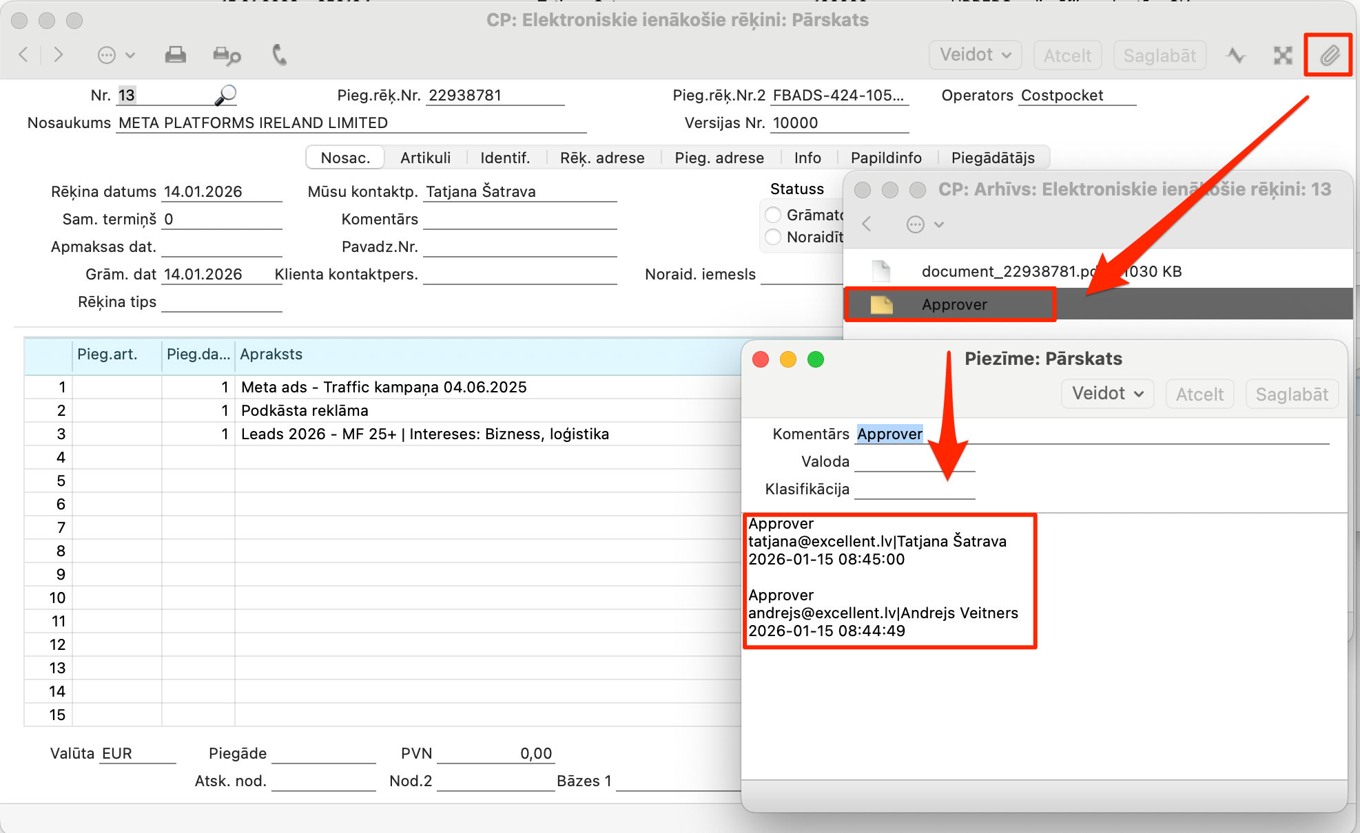 3. Kad abas iepriekšminētās darbības paveiktas, sistēmā ienākošajam e-rēķinam (Piegādātāji > Reģistri > Ienākošie e-rēķini), kurš atbilst Costpocket pusē iestatītajiem izdevumu apstiprināšanas nosacījumiem, zem piespraudes pievienotajās piezīmēs būs redzami visi dokumenta apstiprinātāji un laiks, kad apstiprinājums piešķirts.