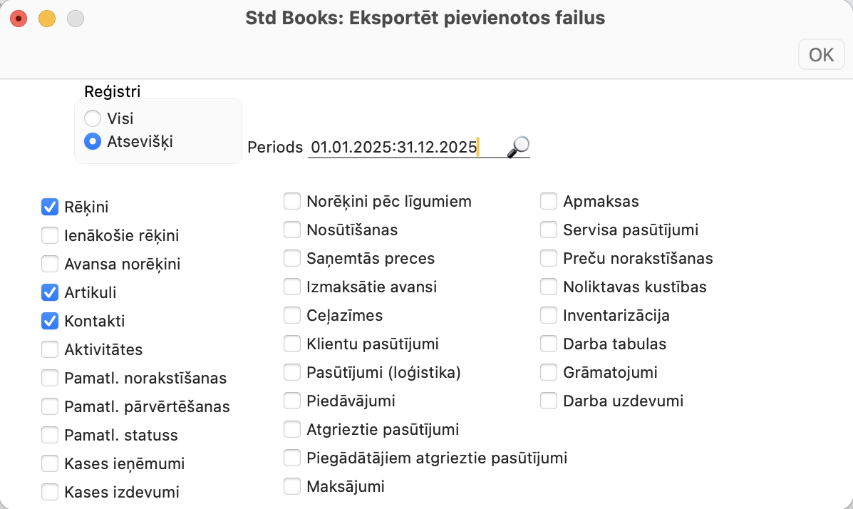 Reģistri – Atsevišķi – varat eksportēt konkrētus reģistrus, piemēram, tikai realizācijas rēķiniem pievienotos failus.