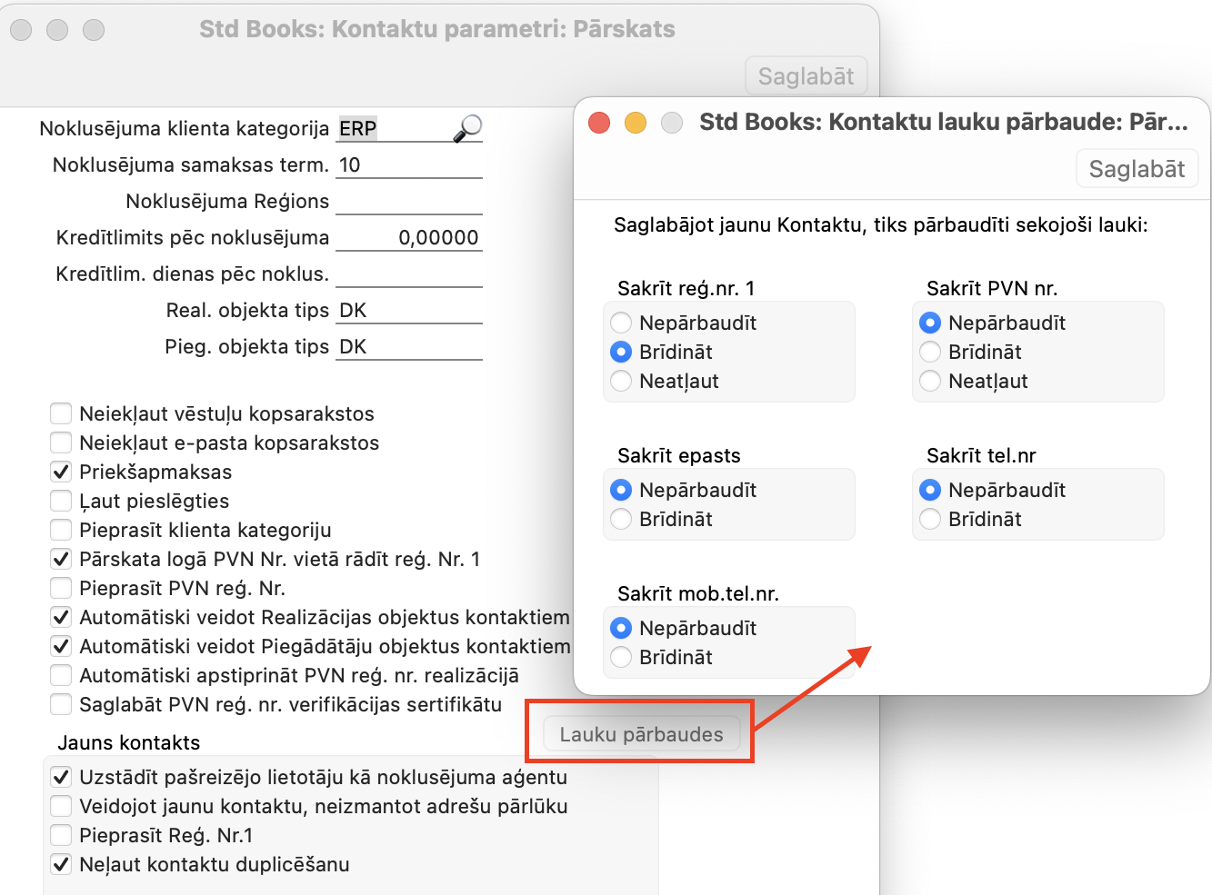 Saglabājot jaunu kontakta ierakstu, programma neatļaus/nepārbaudīs/brīdinās, ja kāds no minētajiem laukiem sakritīs ar kādu jau esošu kontaktu.