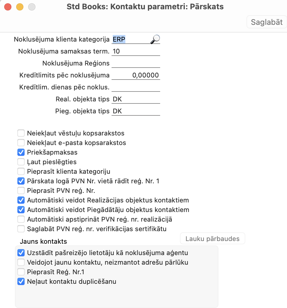“Kredītlimits pēc noklusējuma” un “Kredītlimita dienas pēc noklusējuma” – aizpildot šos laukus, šīs vērtības tiks automātiski ievadītas jaunā Kontakta kartītē, laukos “Klienta kredītlimits” un “Klienta kredītlimita dienas”.
