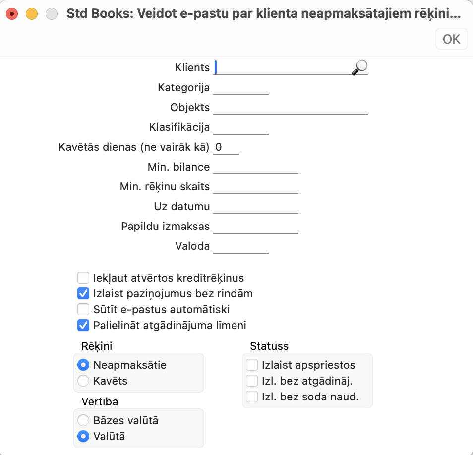 Izvēloties Realizācija > Rutīnas > Apkalpošana > Veidot atgādinājuma epastu tiks nosūtīts viens e-pasts par katru rēķinu. Ja ir norādīts klients, tiks nosūtīts viens e-pasts ar visiem atvērtajiem rēķiniem.