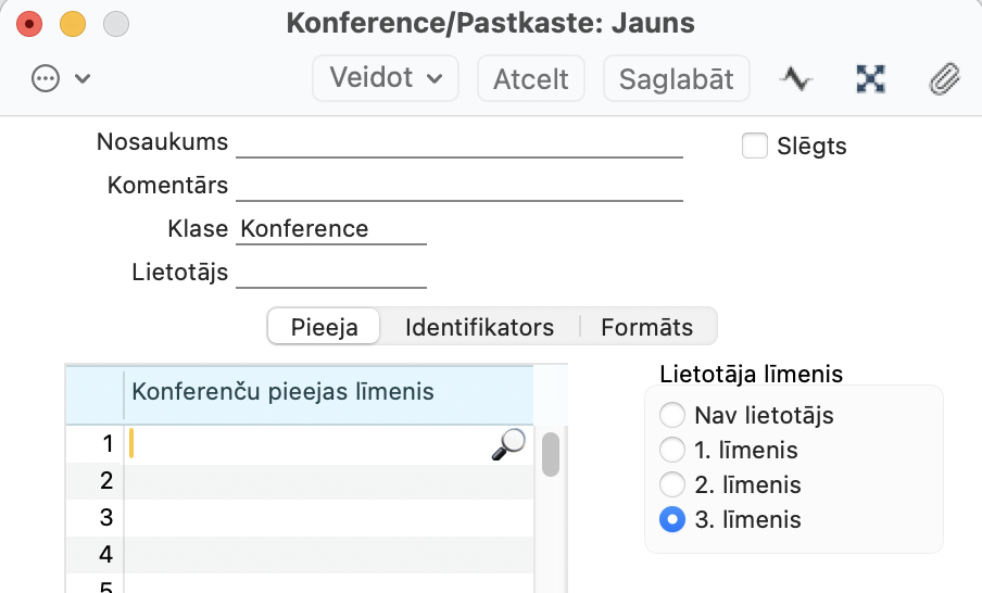 Ja Konferenču pieejas līmenis atstāsiet tukšu – tās saturs būs pieejams visiem programmas lietotājiem. Ja norādīsiet jau esošu Pieejas līmeņa grupu vai veidosiet jaunu, konferenci varēs atvērt lietotājs, kam ir pievienota tāda pati Pieejas līmeņa grupa lietotāja pastkastei.
