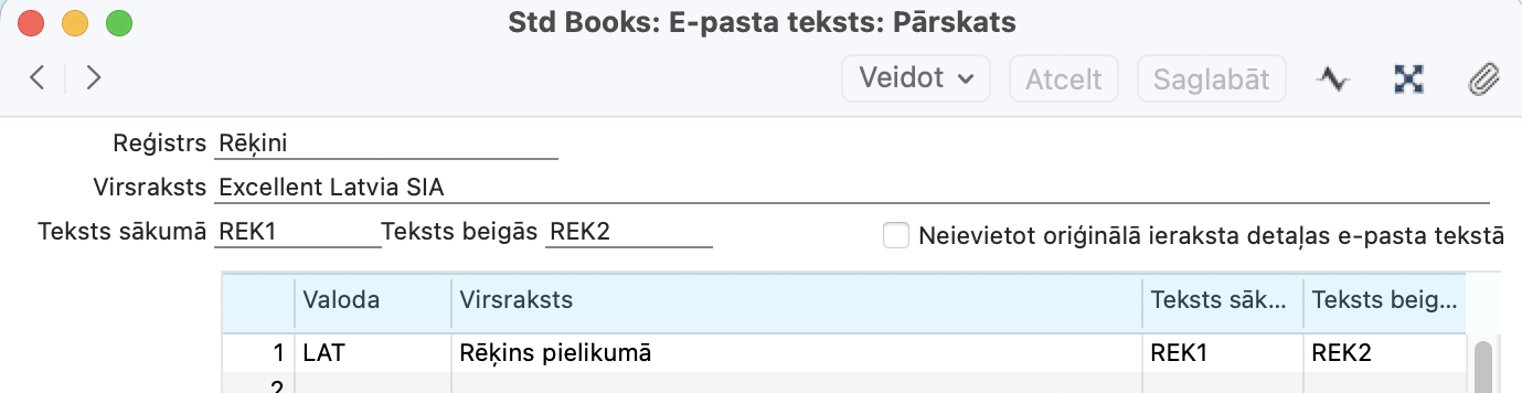 Piemēram, ja veidojat e-pastu par realizācijas rēķinu, tēmas rindiņa un pamatteksts tiek ņemti no iestatījuma E-pastu teksti, kur no saraksta ir izvēlēts “Rēķini” . Varat izvēlēties dažādu dokumentu e-pasta saturu. Šo iestatījumu varat izmantot arī pasūtījumiem, piedāvājumiem, neapmaksātajiem rēķiniem un citiem dokumentiem. Detalizēts lietojums aprakstīts tālāk.