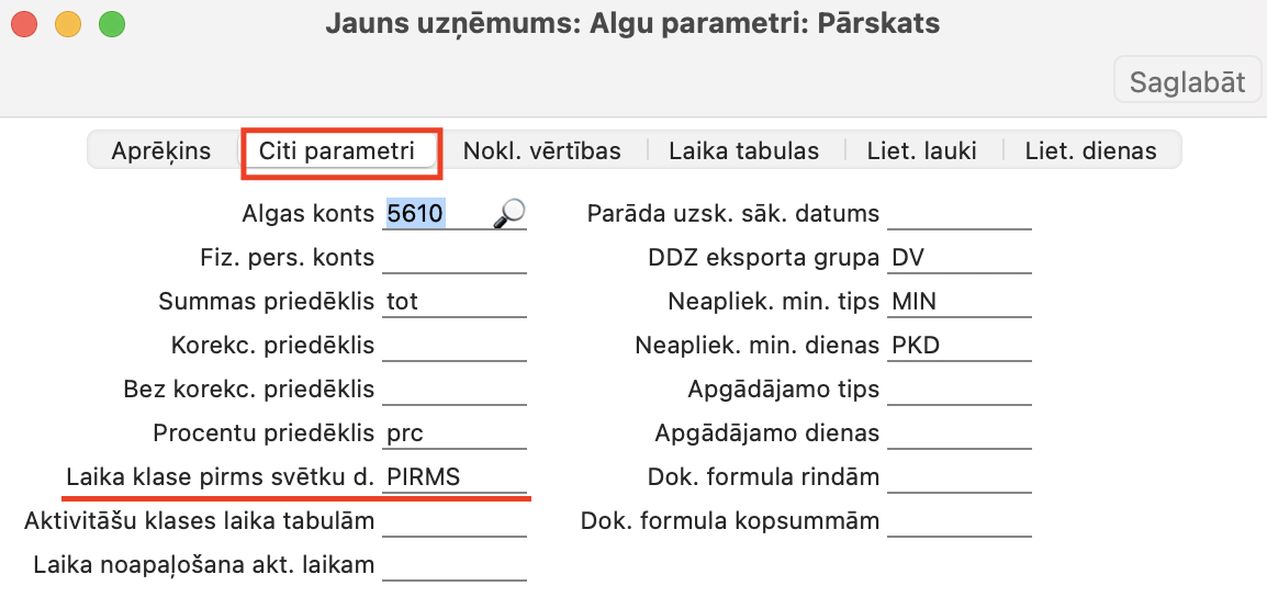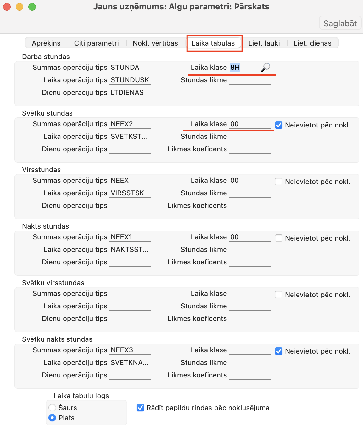 - Algas > Iestatījumi > Algu parametri > Laika tabulas > laukos “Laika klase” ievietojiet Personāls > Iestatījumi > Laika klases izveidoto ierakstu, kas nodefinē standarta laika klasi.