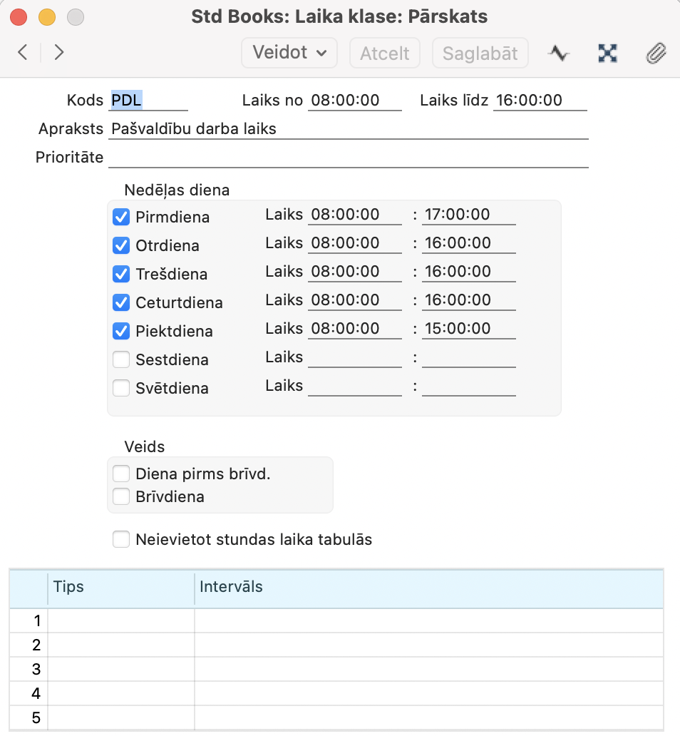 Sākot ar versiju 8.5 2024-01-27-3464 iestatījums Laika klase tiek papildināts ar iespēju iestatīt katrai nedēļas dienai sākuma un beigu laiku.