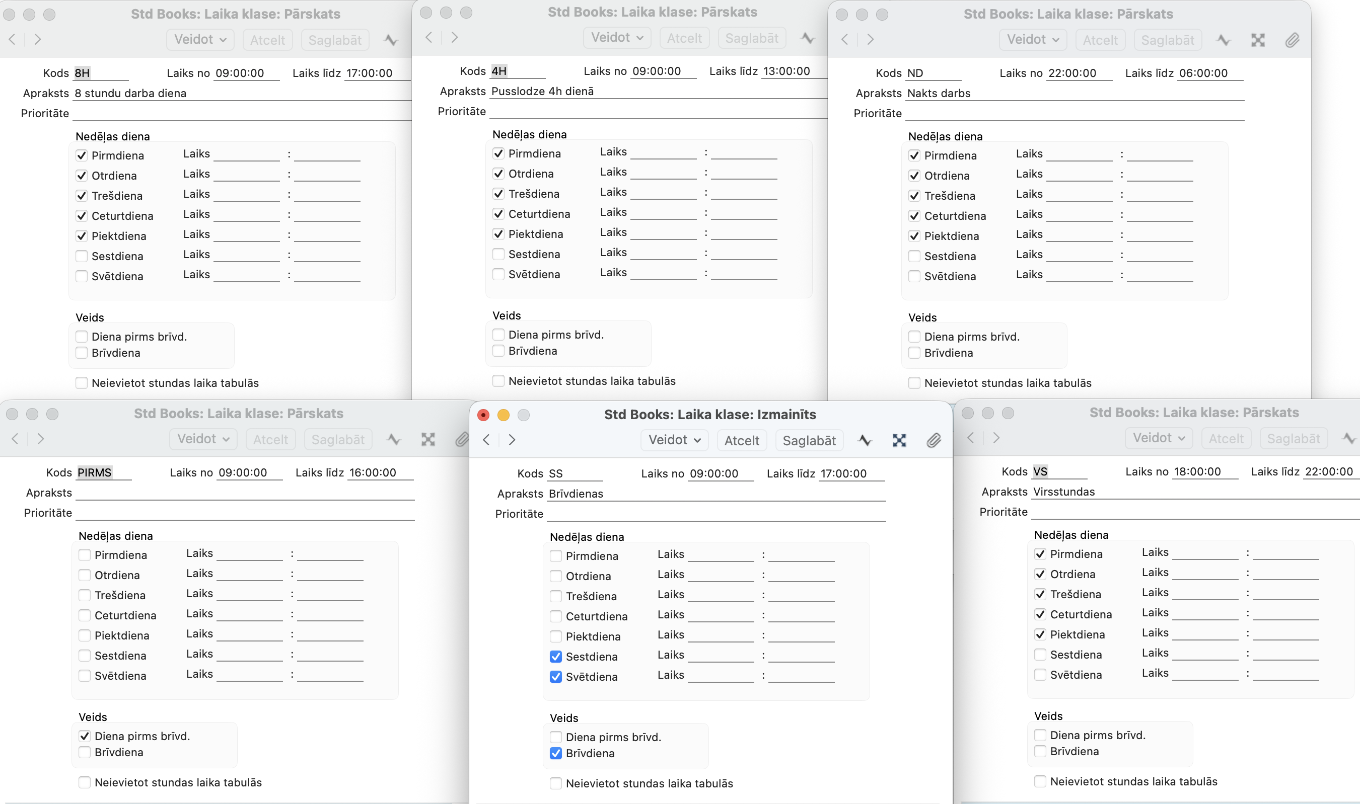 Nedēļas dienas – ja darbiniekam standartā ir noteikta 6 darba dienu nedēļa, tad tiks arī atzīmēta sestdiena)