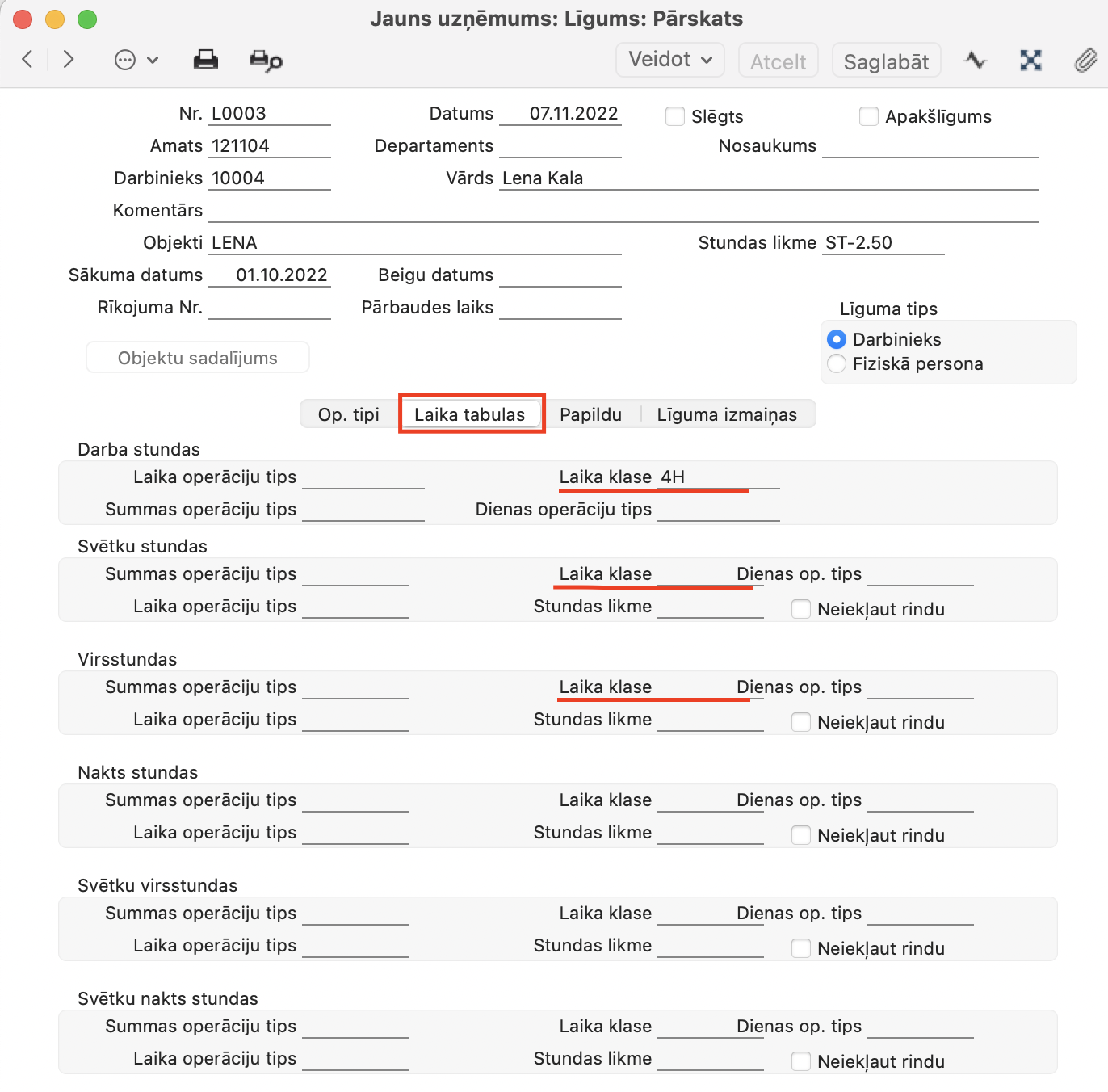 2. Lai iestatījums tiktu pielietots konkrētam darbiniekam, tad to ir nepieciešams iestatīt modulī Algas > Reģistrs > Līgumi > konkrētā darbinieka līguma ierakstā > Laika tabulas > laukos “Laika klase”.