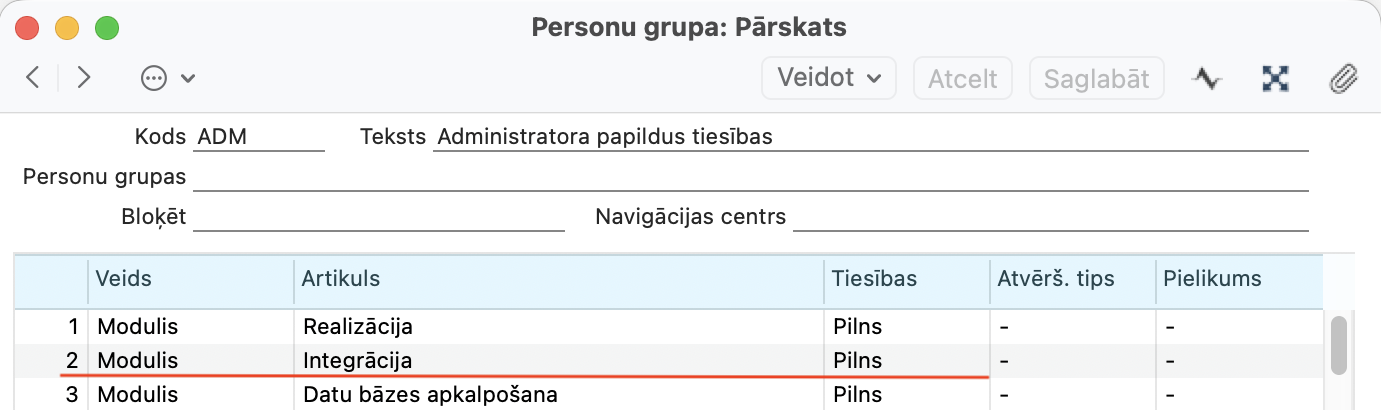 1. Modulis Sistēma > Iestatījumi > Personu grupas >Veidot jaunu personas grupu (vai izmantot jau esošo), piemēram ADMIN (Administrators). Kolonnā “Veids” izvēlēties “Modulis”, kolonnā “Artikuls” izvēlēties “Integrācija”, kolonnā “Tiesības” izvēlēties “Pilna”.