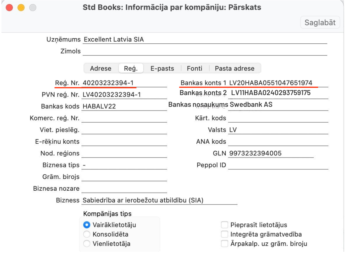 5. Modulī Sistēma > Iestatījumi > Informācija par Kompāniju jābūt norādītam gan reģistrācijas numuram, gan Bankas konts 1 (IBAN, ja izmantojat versiju vecāku par Novembris 2025 (8.5 2025-06-26))