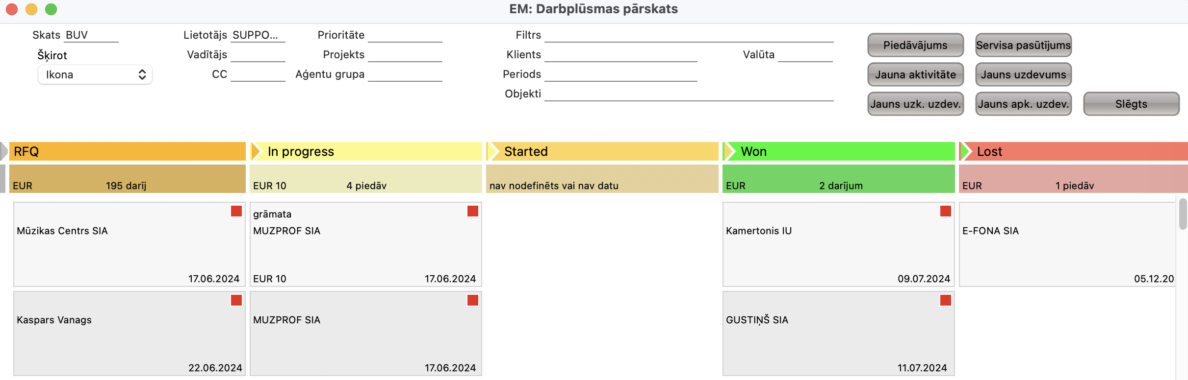 • Aktivitātes var filtrēt pēc pārdevēja, perioda, klienta, utt.