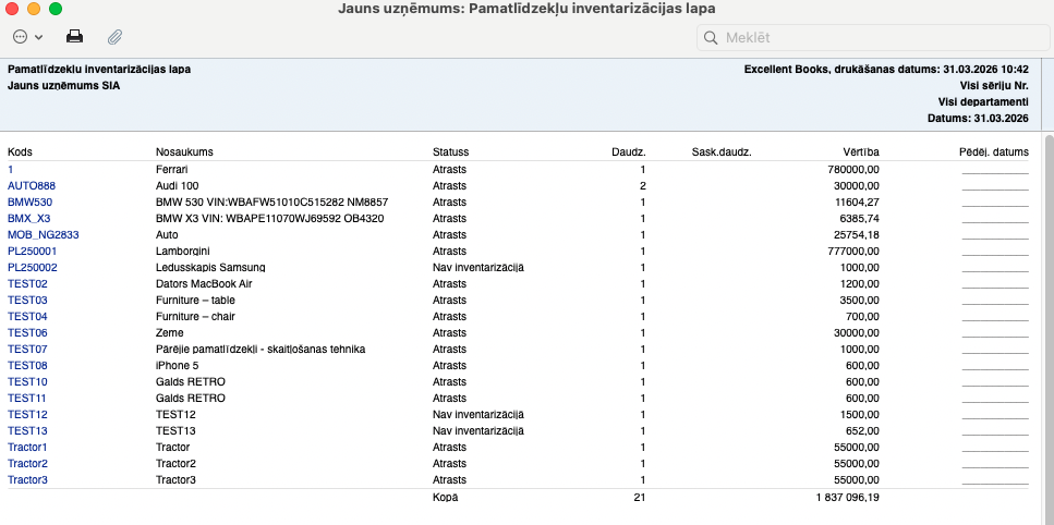 Dodieties uz Pamatlīdzekļi > Atskaites > Pamatlīdzekļu inventarizācijas lapa.