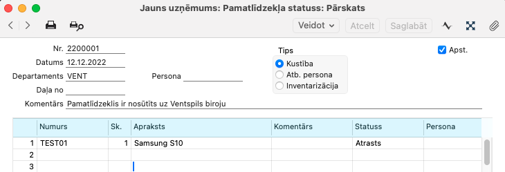 - Pamatlīdzekļu statusa reģistra (ieraksti ar tipu “Inventarizācija”)
